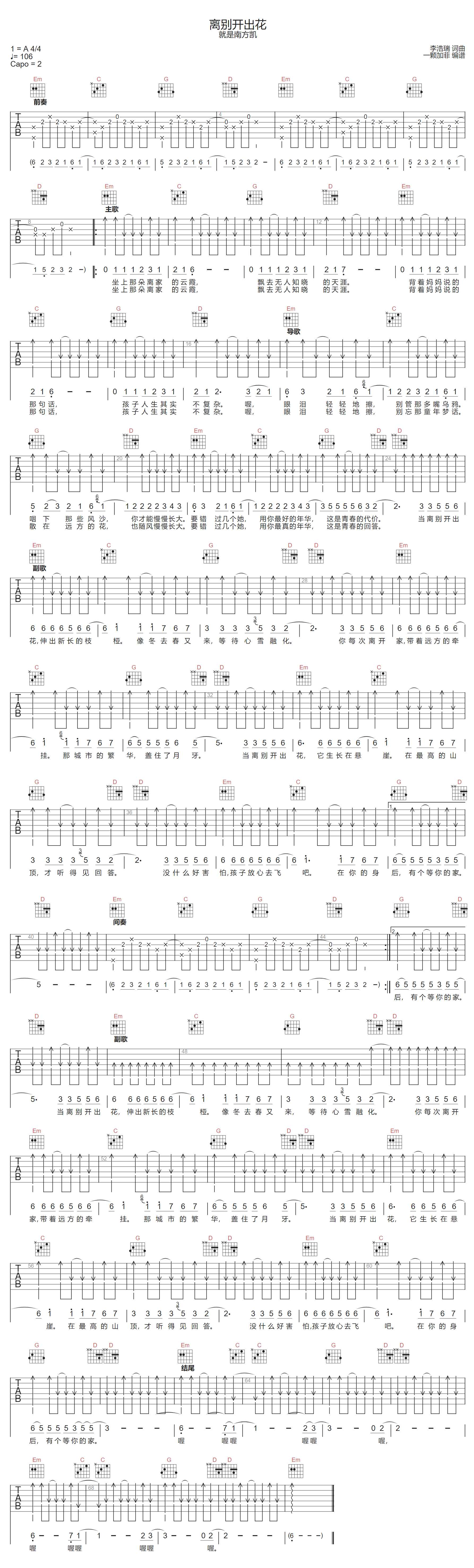 曲谱介绍: 就是南方凯演唱的一首歌曲,4/4拍的节奏,这首歌曲的原调为A调,这里曲谱采用了G调指法进行编配,演唱时夹变调夹2品可回到原调,也可根据个人实际嗓音情况选择。曲谱由琴谱网更新上传,来源于@一颗加菲编配出品。这首歌充满了对离别的感慨和对未来的期待。歌词中描绘了一幅离别的画面,让人们感受到离别的痛苦和无奈。
