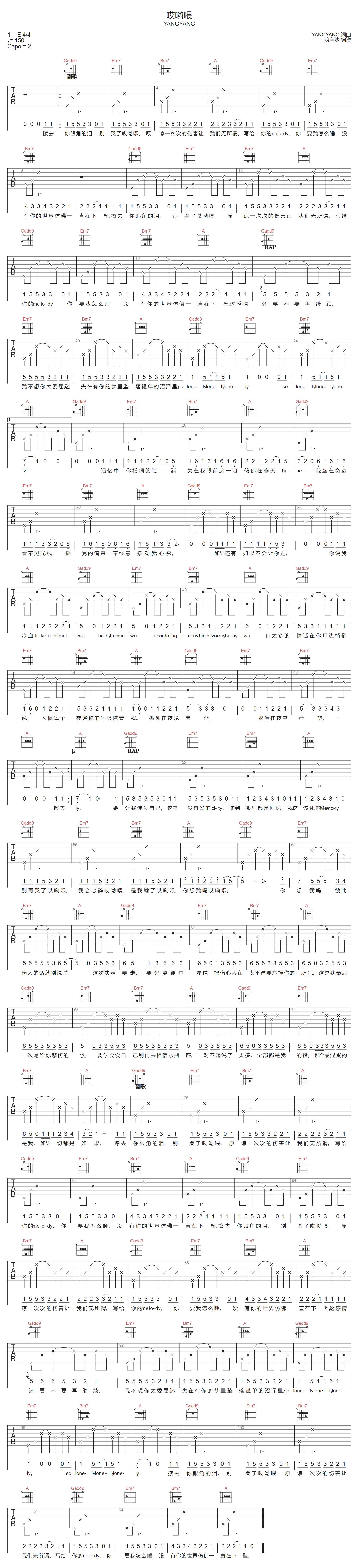 曲谱介绍: YANGYANG演唱的一首歌曲,4/4拍的节奏,这首歌曲的原调为E调,这里曲谱采用了D调指法进行编配,演唱时夹变调夹2品可回到原调,也可根据个人实际嗓音情况选择。曲谱由琴谱网更新上传,来源于@浪淘沙编配出品。“有太多的情话在你耳边悄悄说,习惯每个夜晚你的呼吸陪着我,孤独在夜晚蔓延,眼泪在夜空盘旋,擦去你眼角的泪,别哭了哎呦喂。”