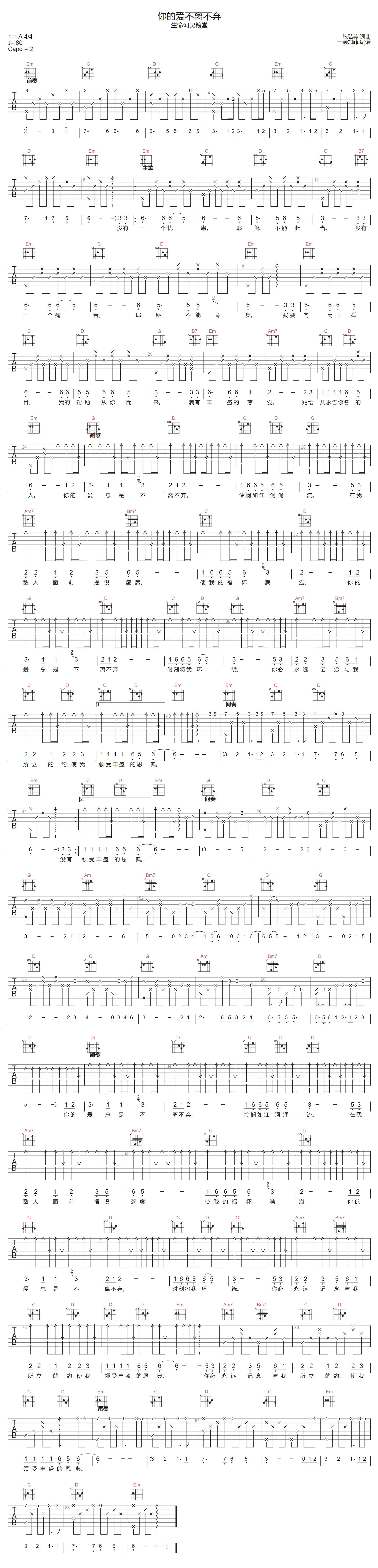 曲谱介绍: 生命河灵粮堂演唱的一首歌曲,4/4拍的节奏,这首歌曲的原调为A调,这里曲谱采用了G调指法进行编配,演唱时夹变调夹2品可回到原调,也可根据个人实际嗓音情况选择。曲谱由琴谱网更新上传,来源于@一颗加菲编配出品。“你的爱总是不离不弃,怜悯如江河涌流,在我敌人面前为我摆设宴席,使我的福杯满溢,你的爱总是不离不弃,时刻将我环绕”。