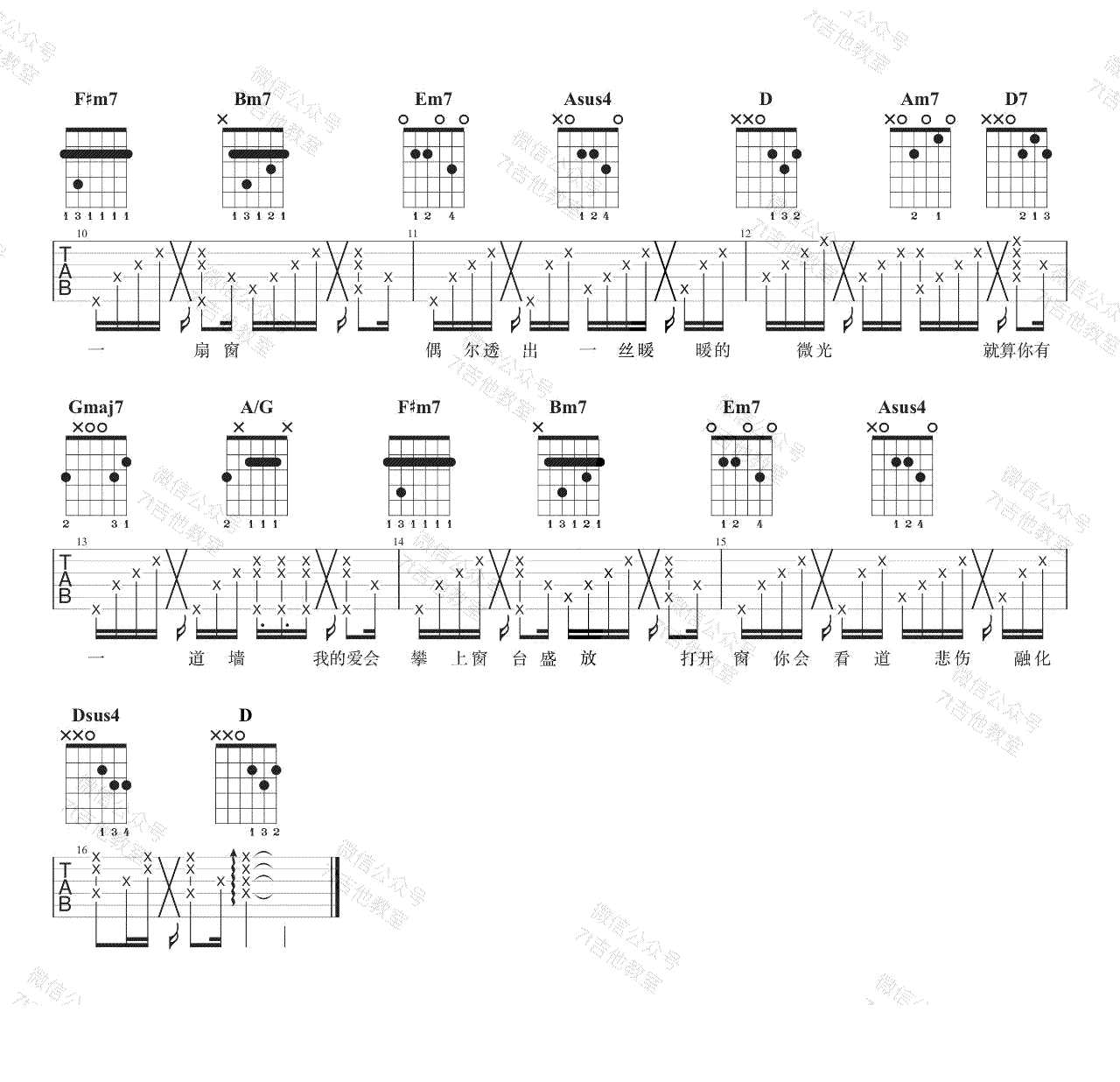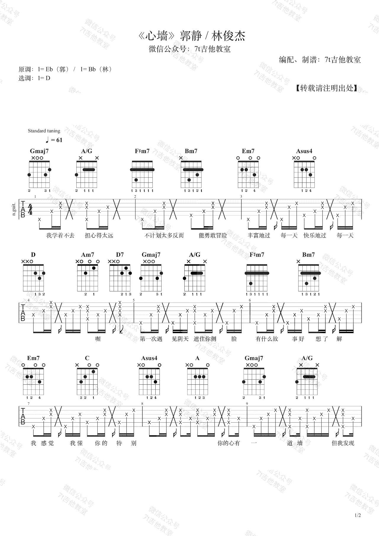 曲谱介绍: 郭静演唱的一首歌曲,4/4拍的节奏,这首歌曲的原调为降E调,这里曲谱采用了D调指法进行编配,演唱时夹变调夹1品可回到原调,也可根据个人实际嗓音情况选择。曲谱由琴谱网更新上传,来源于@7T吉他教室编配出品。这首歌林俊杰也唱过,女歌男唱,JJ透过自己的观点,全新诠释演唱了《心墙》这首歌。在歌里只用哀伤的吉他贯穿全局,所以整首歌听起来清新又悲伤。  吉他弹唱演示及视频教学