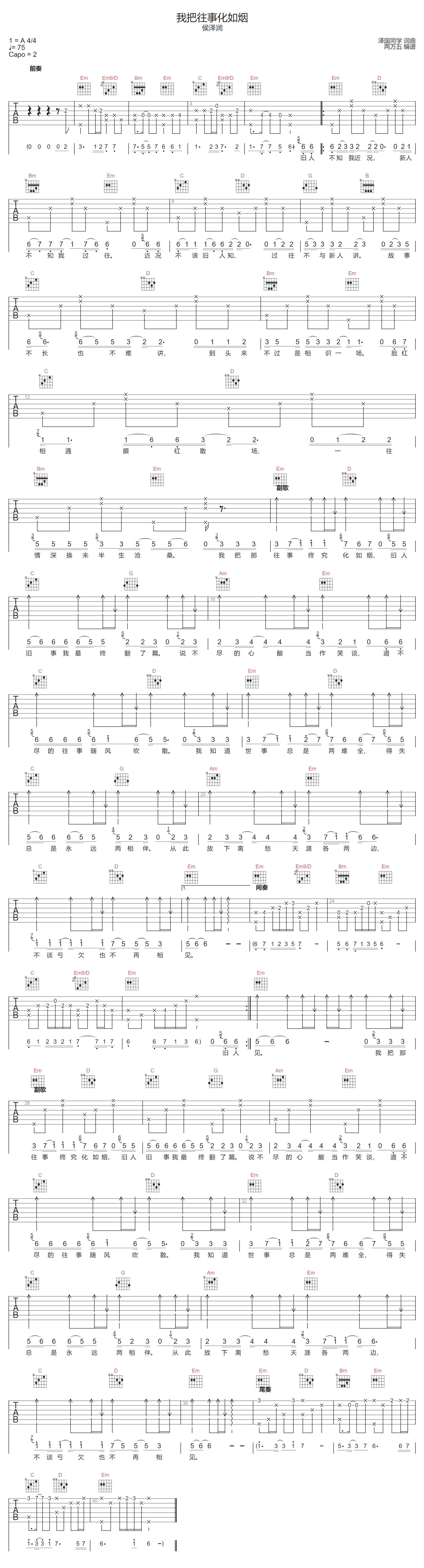 我把往事化如烟吉他谱 - 侯泽润 - G调吉他弹唱谱 - 原版
