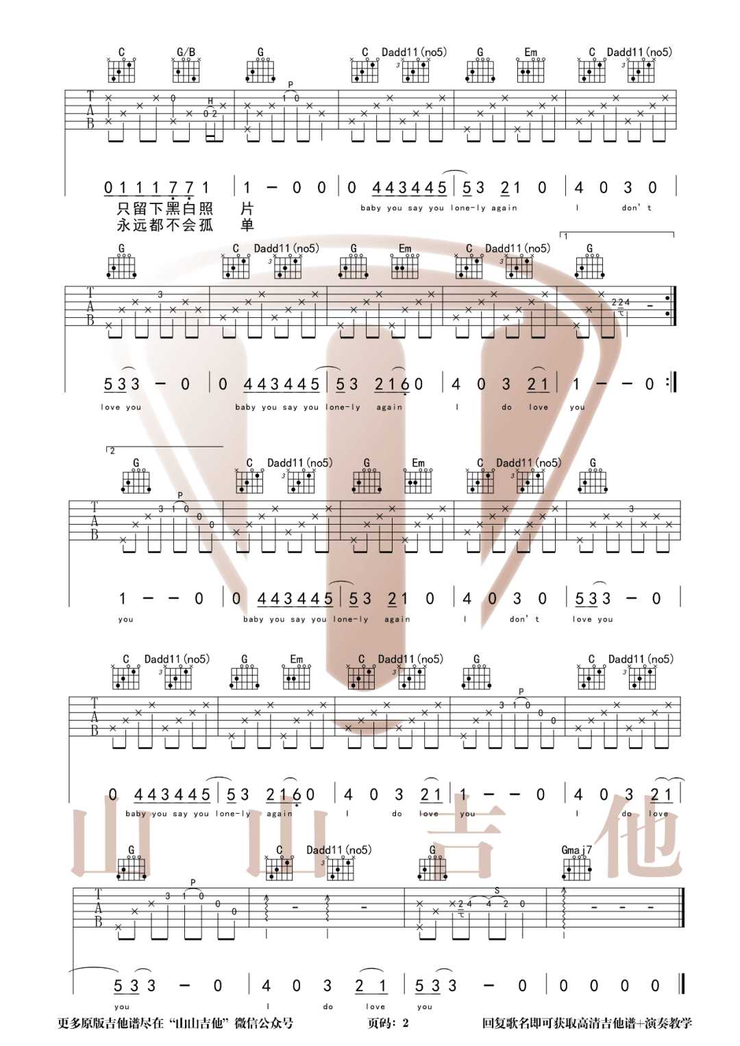 曲谱介绍: 马赛克乐队演唱的一首歌曲,4/4拍的节奏,这首歌曲的原调为G调,这里曲谱采用了G调指法进行编配,演唱时可不夹变调夹,曲谱由琴谱网更新上传,来源于@山山吉他编配出品。这首歌很有意思,它只有主歌和副歌,没有桥段部分。而副歌的最后的一分句“Idoloveyou”不断地重复,这也是这首曲子的特色。结尾的乐器部分用乐器“尾声”来表达更好一些,因为歌曲基本收尾了。
