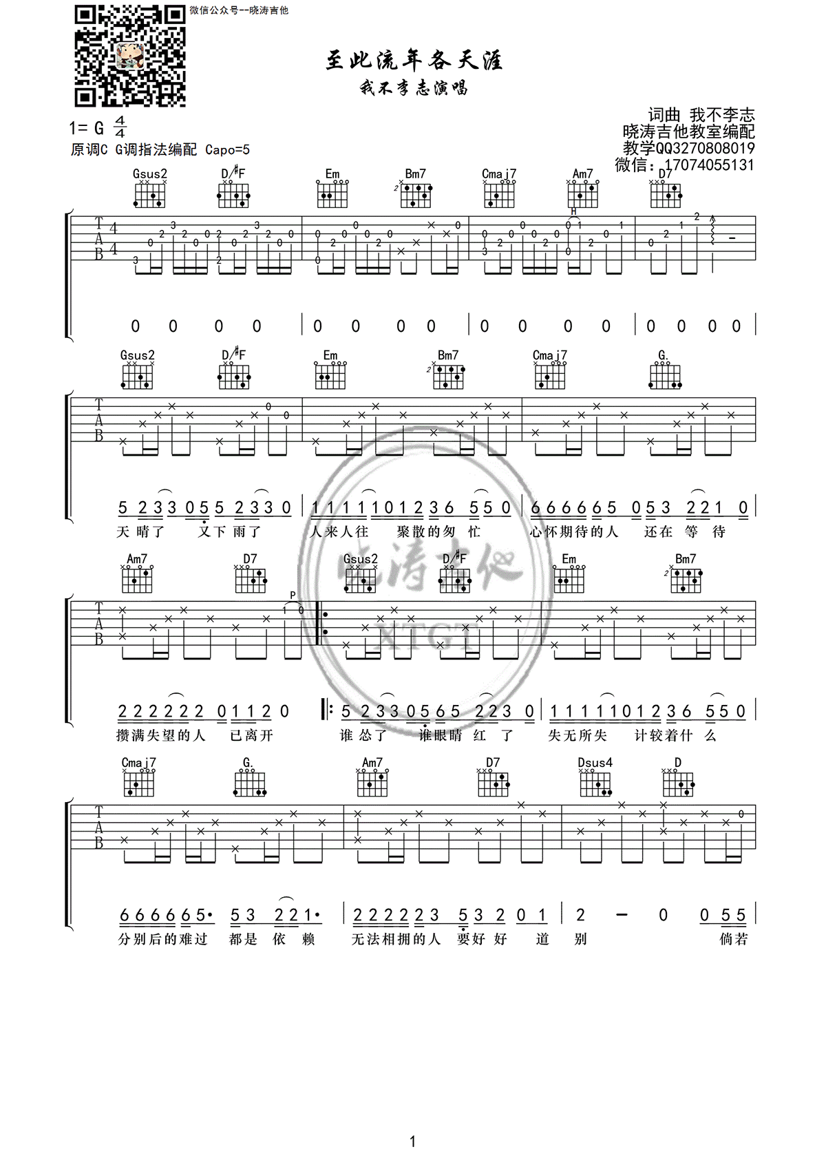 曲谱介绍: 我不李志演唱的一首歌曲,4/4拍的节奏,这首歌曲的原调为C调,这里曲谱采用了G调指法进行编配,演唱时夹变调夹5品可回到原调,也可根据个人实际嗓音情况选择。曲谱由琴谱网更新上传,来源于@晓涛吉他编配出品。这首民谣歌曲虽然由我不李志所唱,但词曲却是李志所写,平淡的语调讲述了告别与怀念,正如这歌名一样,至此流年各自在天涯,分别也显得不那么忧伤,各自天涯安好。