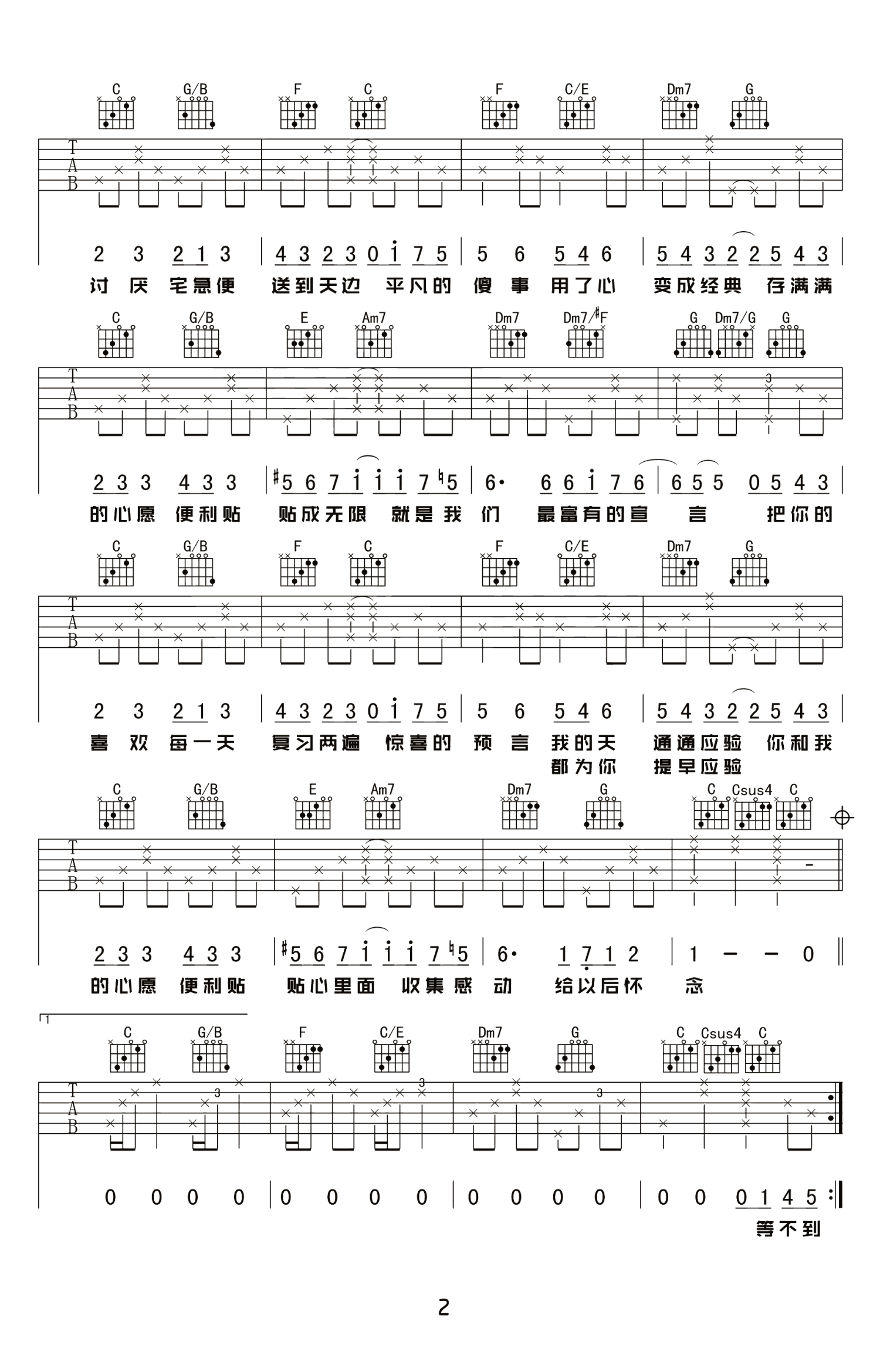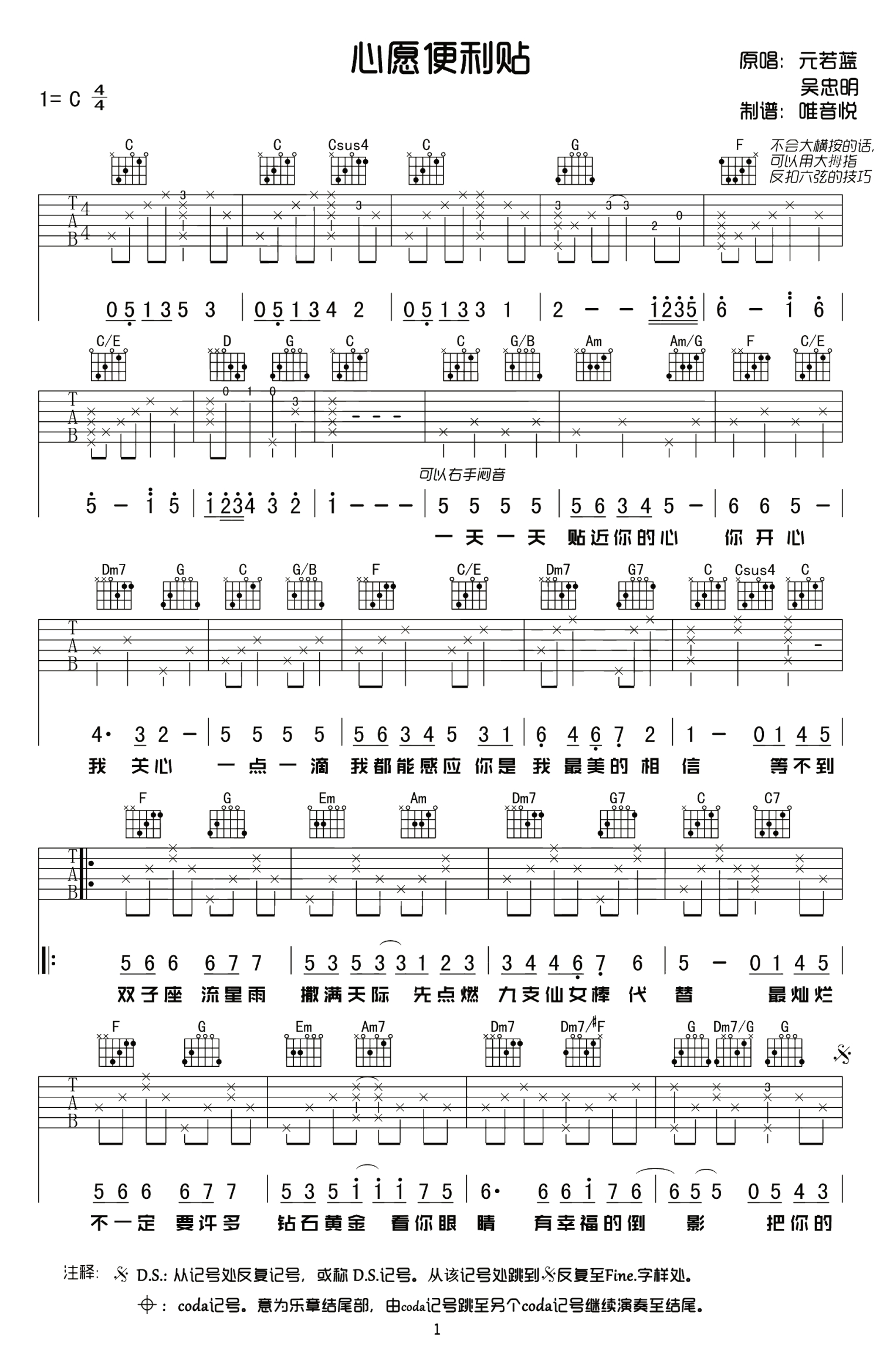 曲谱介绍: 心愿便利贴吉他谱,台湾电视剧《命中注定我爱你》的片尾曲,吴忠明元若蓝演唱,《心愿便利贴》六线谱,原版C调简单吉他谱。大家只要把走向给记住了,整首歌其实谱子也就记住啦。总共也就分成3段,主歌:C->G/B/->Am->Am/G->F->C/E->Dm7->G;C->G/B/->F->C/E->Dm7->G->C。过渡:F->G->Em->Am->Dm7->Dm7/#F->G。副歌:C->G/B->F->C/E->F->C/E->Dm7->G;C->G/B->E->Am7->Dm7->Dm7/#F->G