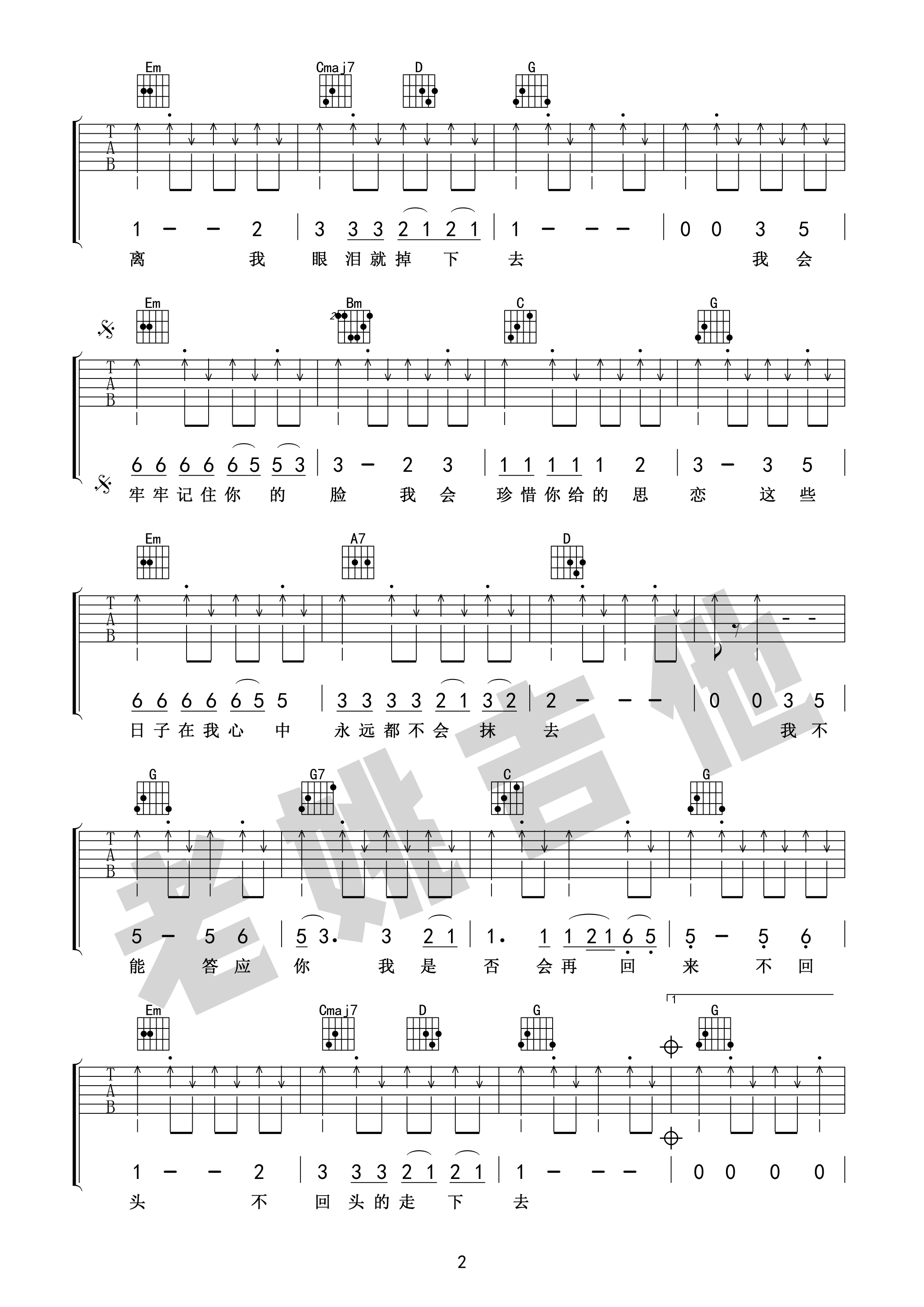 曲谱介绍: 张震岳演唱的一首歌曲,4/4拍的节奏,这首歌曲的原调为#F调,这里曲谱采用了G调指法进行编配,演唱时降半音调弦可回到原调,也可根据个人实际嗓音情况选择不降音或夹几品。曲谱由琴谱网更新上传,来源于@老姚吉他编配出品。这首流行歌曲短小精致、通俗易懂、易学琴谱网易奏、自然简洁流畅、优美悦耳,在艺术上别具一格。在众多抒发离情别绪的流行音乐中,属于中上乘。