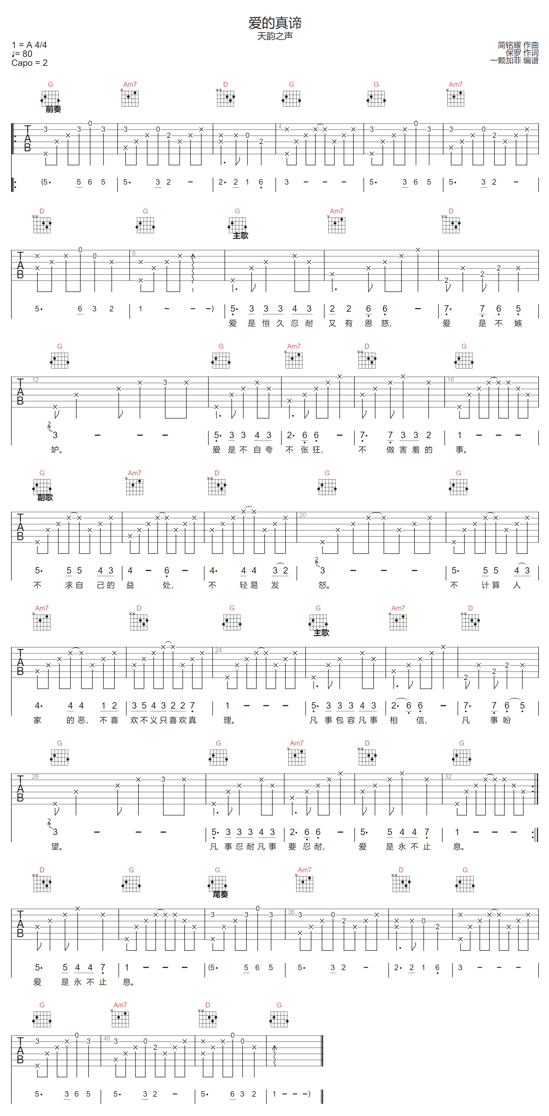 爱的真谛吉他谱 - 天韵之声 - G调吉他弹唱谱