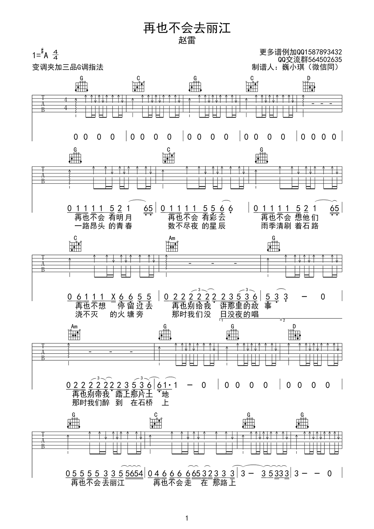 再也不会去丽江吉他谱 - 赵雷 - G调吉他弹唱谱