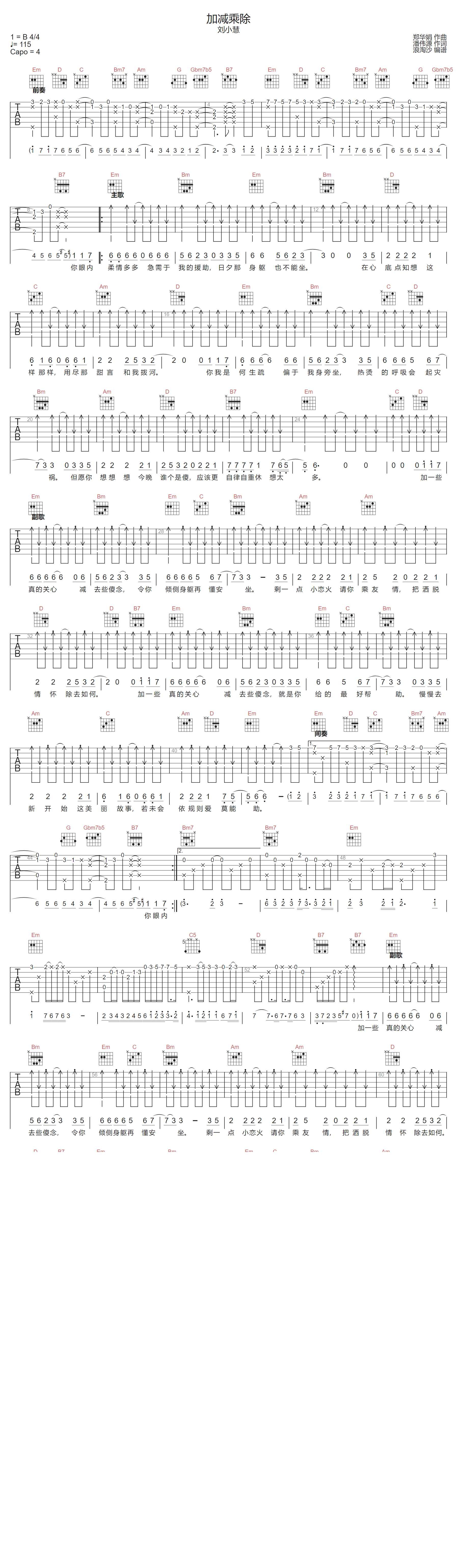曲谱介绍: 刘小慧演唱的一首歌曲,4/4拍的节奏,这首歌曲的原调为B调,这里曲谱采用了G调指法进行编配,演唱时夹变调夹4品可回到原调,也可根据个人实际嗓音情况选择。曲谱由琴谱网更新上传,来源于@浪淘沙编配出品。这是一首有着浓浓港味的歌曲,架子鼓配出来的前奏让人一下子就吸引着耳机,加法爱人,减法恨人,乘法感恩,除法解忧,一首被乐迷称为把人生的秘籍都写在歌词里面的歌曲。