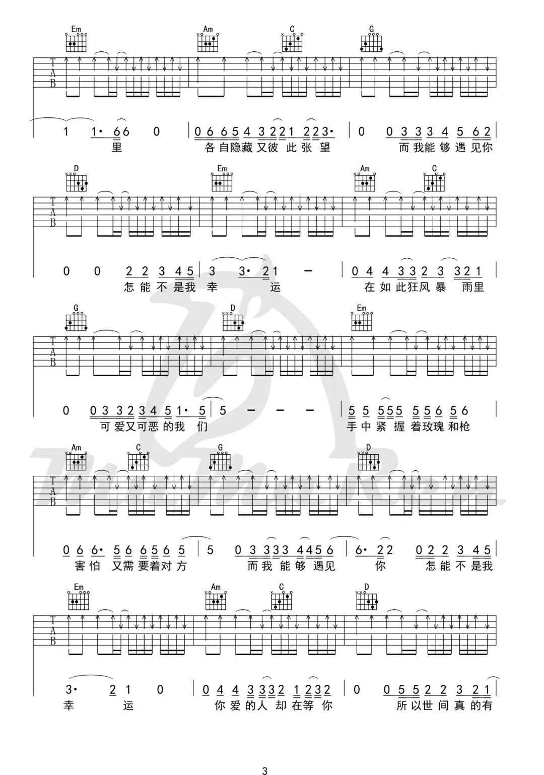 曲谱介绍: 逃跑计划演唱的一首歌曲,4/4拍的节奏,这首歌曲的原调为降B调,这里曲谱采用了G调指法进行编配,演唱时夹变调夹3品可回到原调,也可根据个人实际嗓音情况选择。曲谱由琴谱网更新上传,来源于@牧马人乐器编配出品。我们素昧平生,却被拯救于幽暗谷底。我们来自各行各地,却在灾难面前结下遥远又深厚的友谊。谢谢你们在他人最需要的时候伸出仁爱与关怀的友谊之手,也谢谢那些在寒冬中维持着社会秩序的人们。