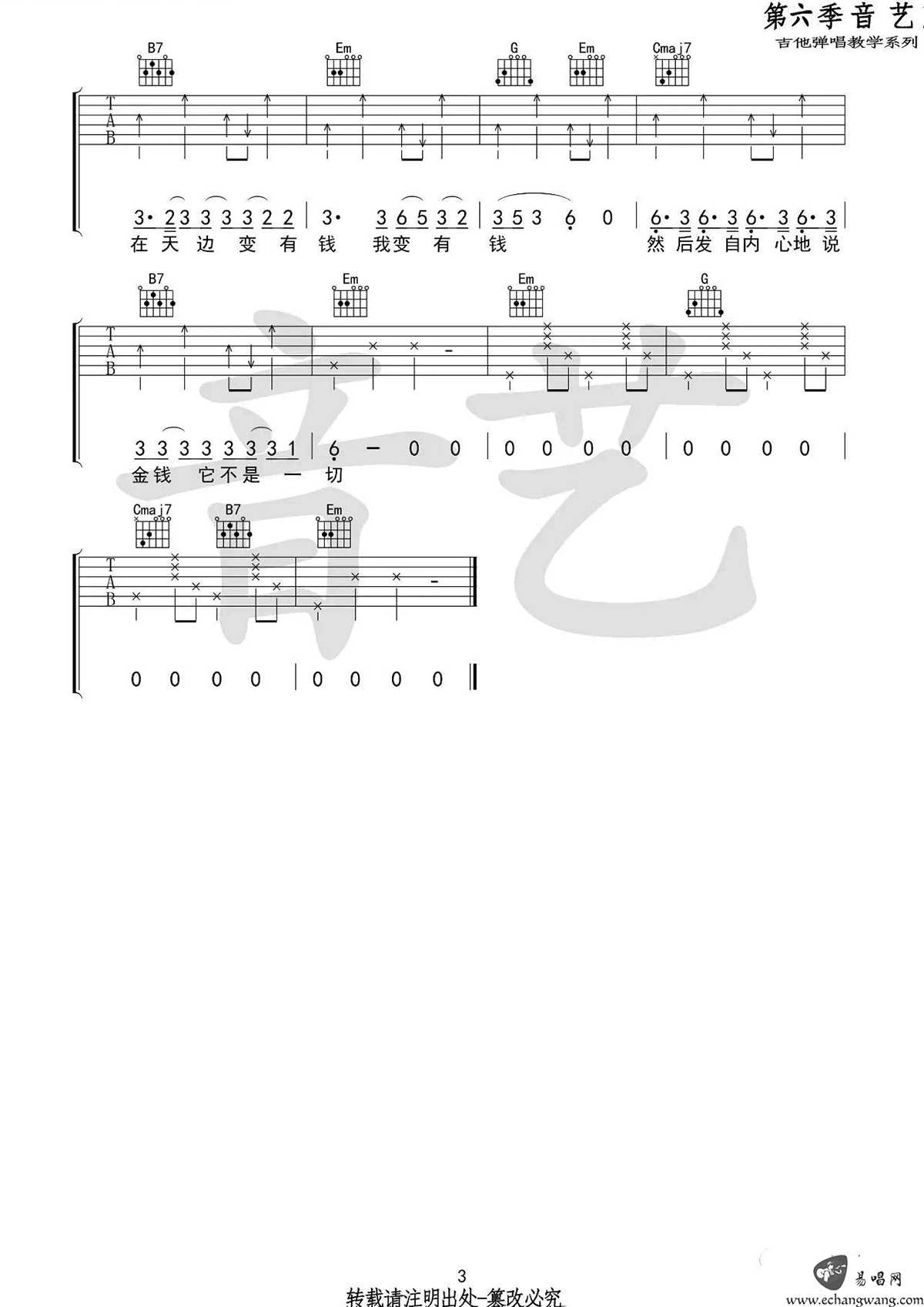 曲谱介绍: 毛不易演唱的一首歌曲,4/4拍的节奏,这首歌曲的原调为G调,这里曲谱采用了G调指法进行编配,演唱时可不夹变调夹,曲谱由琴谱网更新上传,来源于@吉他专家编配出品。毛不易的这首歌用轻快的节奏唱出了对金钱的欲望,对金钱创造的美好生活的向往,把生活世俗唱的清新脱俗。