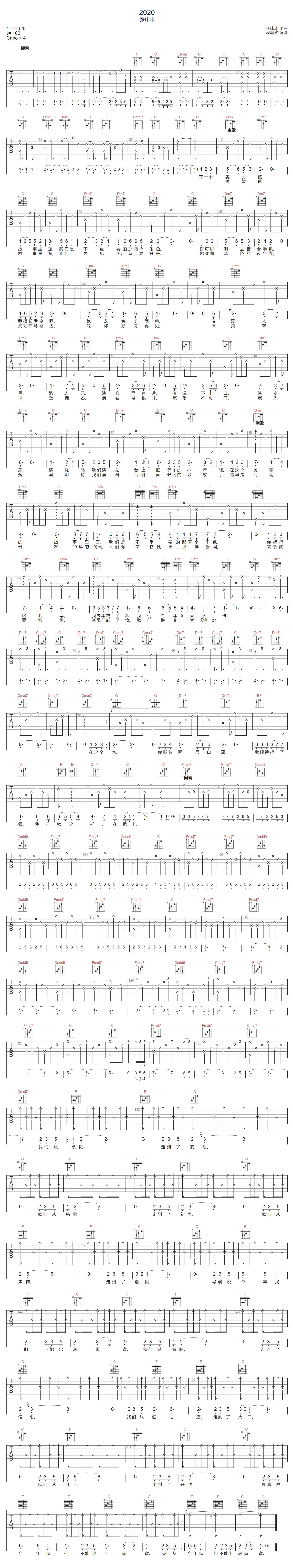 2020吉他谱 - 张玮玮 - C调吉他弹唱谱 - 原版