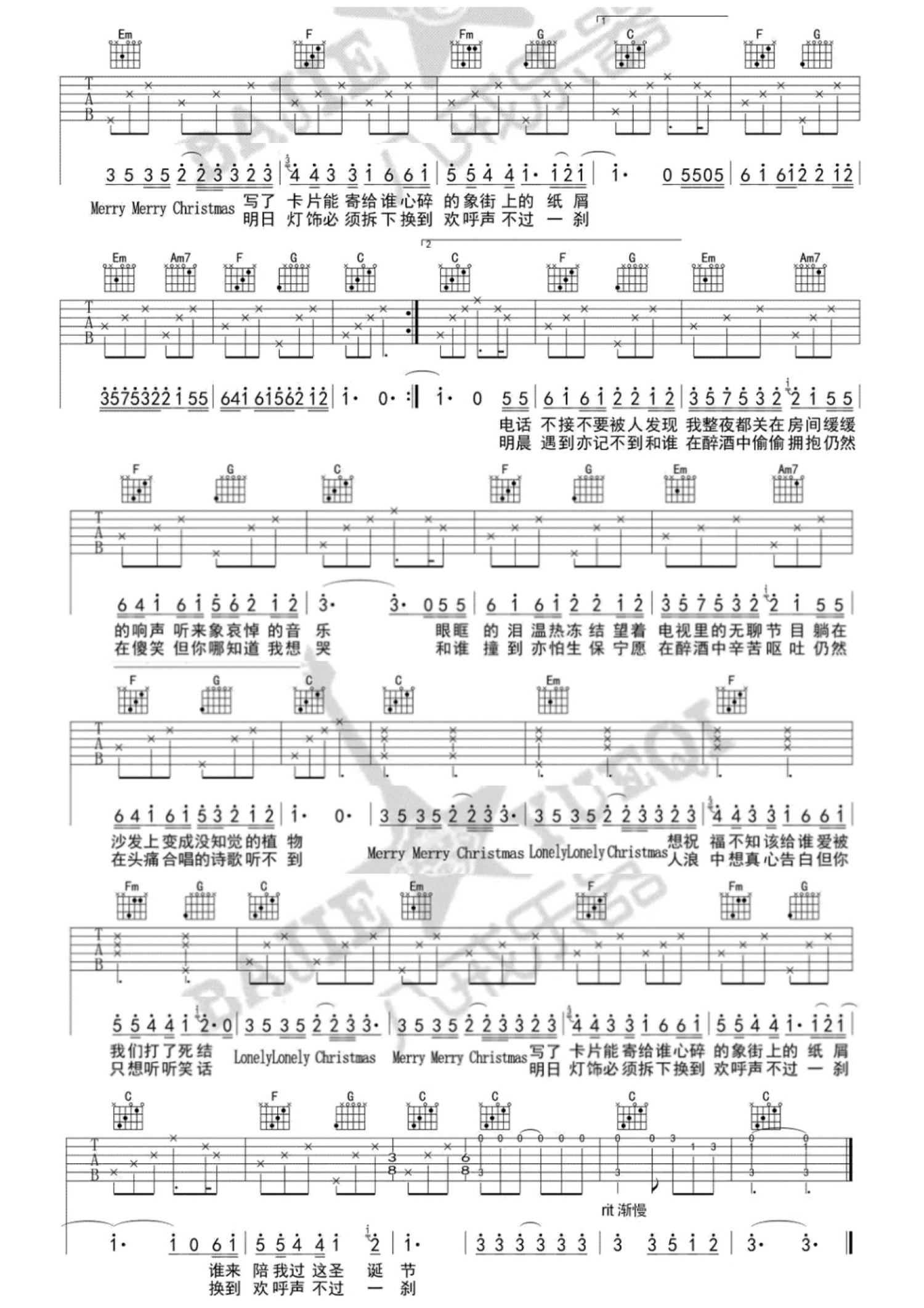 曲谱介绍: 圣诞结吉他谱,陈奕迅演唱的一首圣诞节经典歌曲,粤语版《LonelyChristmas》六线谱,选调C男生版,女生建议变调夹3-5品,圣诞结吉他弹唱谱,国语+粤语歌词,一年听一次陈奕迅的圣诞结,就像是打开了一个回忆的盒子。喜欢自己依旧lonely感叹爱过的人没有一个留在身边。羡慕这个寒冷冬天都有伴温暖的人也羡慕那些心里住着一个如太阳般温暖的人。而自己呢?还是努力去遇见那个人吧。