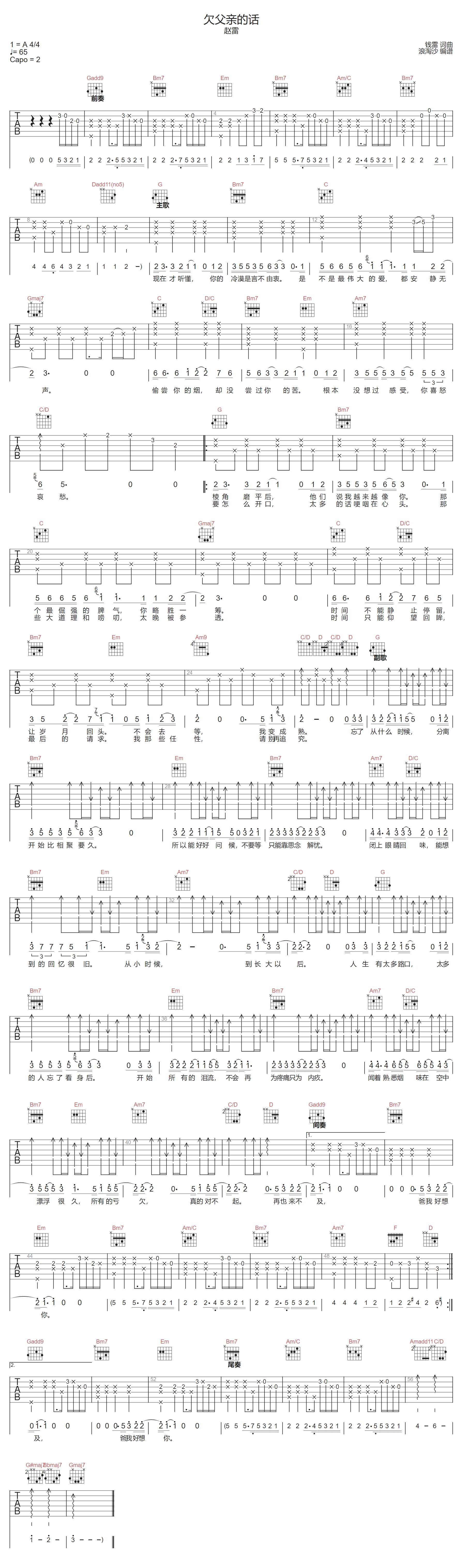 曲谱介绍: 赵雷演唱的一首歌曲,4/4拍的节奏,这首歌曲的原调为A调,这里曲谱采用了G调指法进行编配,演唱时夹变调夹2品可回到原调,也可根据个人实际嗓音情况选择。曲谱由琴谱网更新上传,来源于@浪淘沙编配出品。 《欠父亲的话》赵雷演唱的一首民谣曲风歌曲 ,也是电影《我爸没说的那件事》的主题曲,发行于2023年10月16日,由张畅、胡志敏、郭姿涵作词,钱雷作曲并担任制作人,收录在赵雷年发行的同名专辑《欠父亲的话》中。 这首歌和雷子其他音乐的最大区别是这首歌不是雷子自己创作的,虽然也是民谣风格,但是很明显和雷子创作的音乐风格有些差异,雷子自己创作的音乐大多比较洒脱,但是这首歌感情很细腻,所以必须值得一听!而且这首歌中的很多场景都会引起粉丝的共鸣,仿佛就是在讲述听众和自己父亲之间的故事。