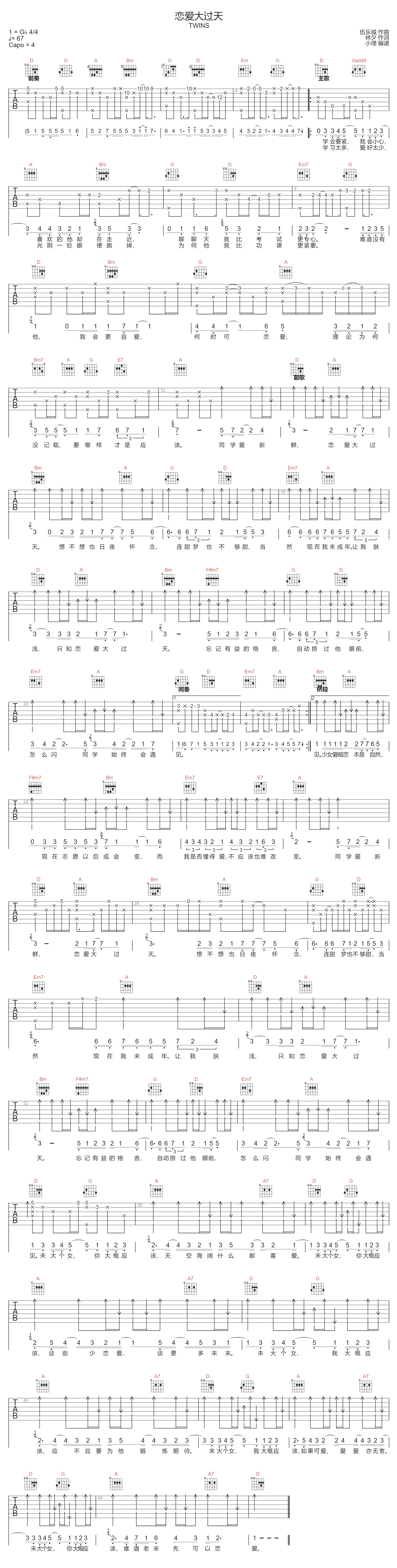 曲谱介绍: Twins演唱的一首歌曲,4/4拍的节奏,这首歌曲的原调为#F调,这里曲谱采用了D调指法进行编配,演唱时夹变调夹4品可回到原调,也可根据个人实际嗓音情况选择。曲谱由琴谱网更新上传,来源于@小埋编配出品。 《恋爱大过天》一首暴露年龄的歌,同学爱新鲜,恋爱大过天,想不想也日夜怀念连甜梦也不够甜。满满的回忆。