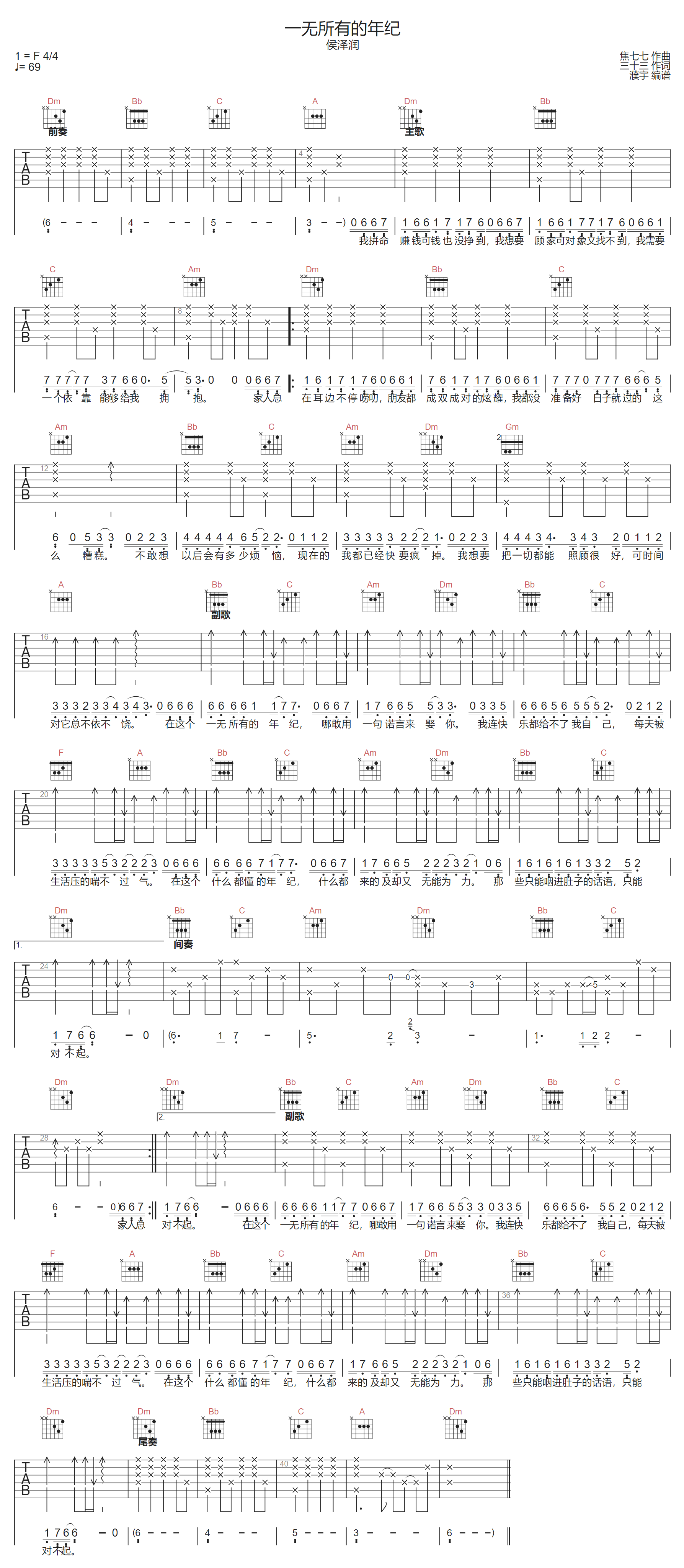 一无所有的年纪吉他谱 - 侯泽润 - F调吉他弹唱谱