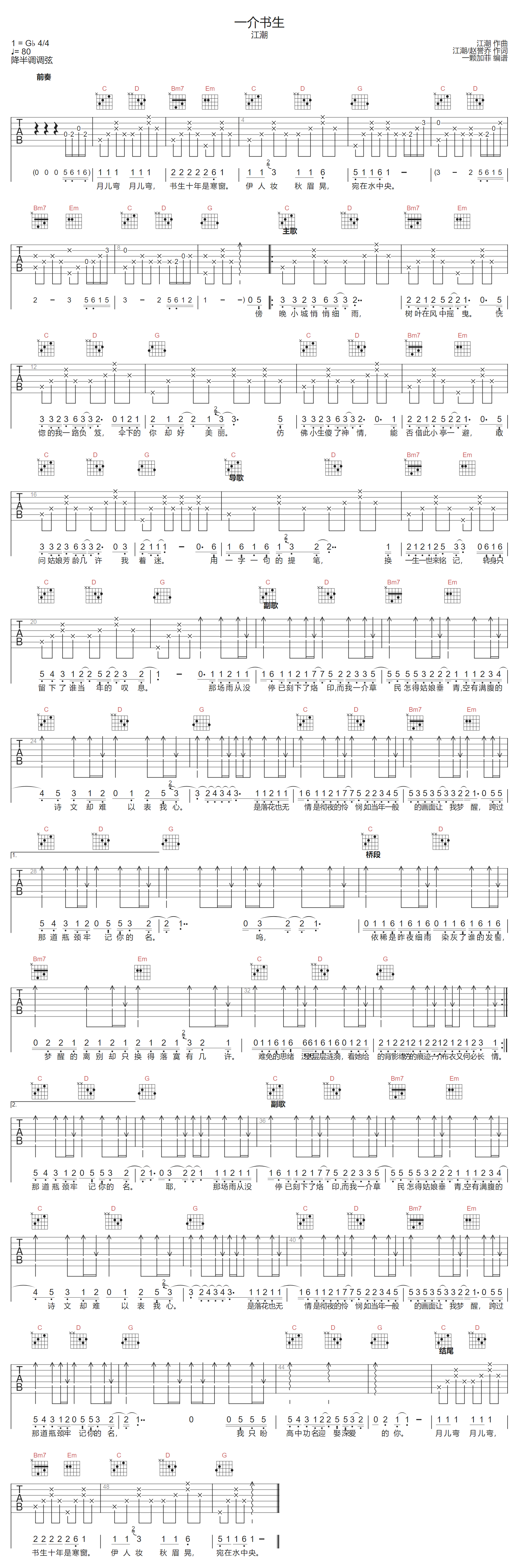 一介书生吉他谱 - 江潮 - G调吉他弹唱谱
