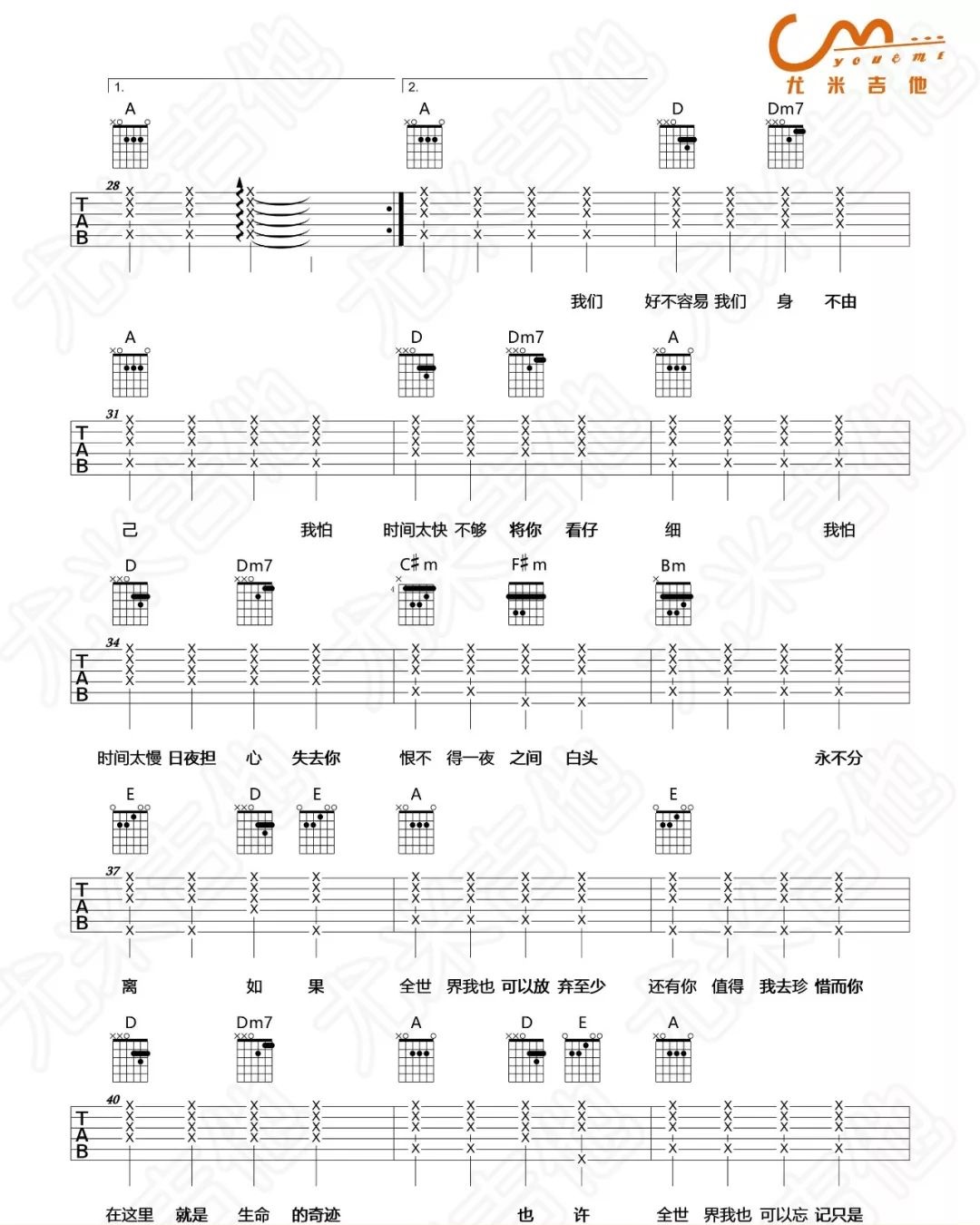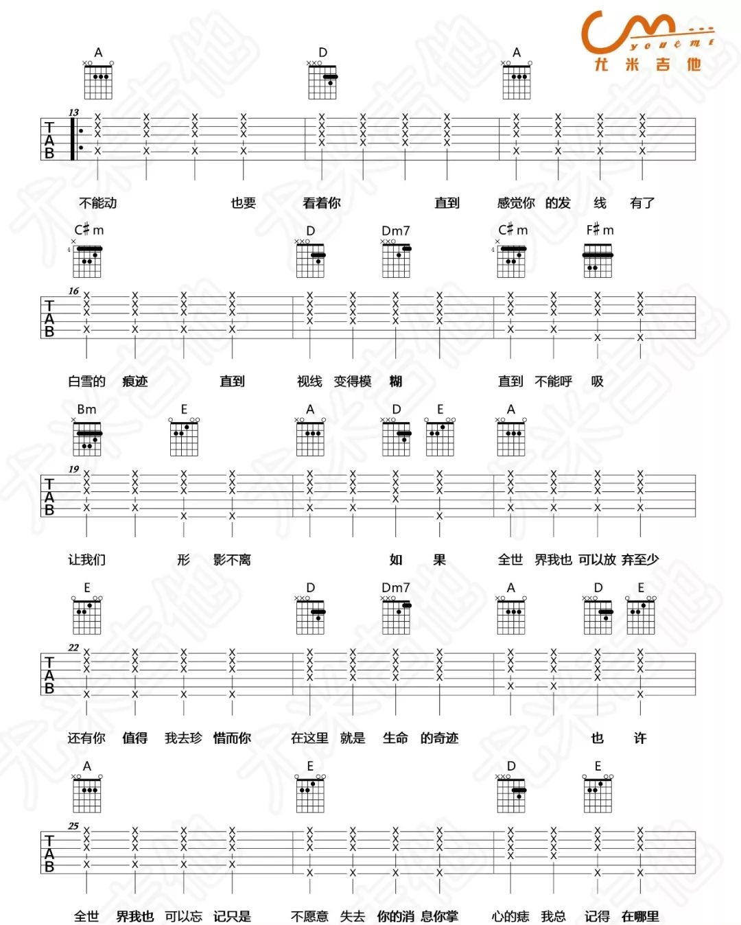 曲谱介绍: 林忆莲演唱的一首歌曲,4/4拍的节奏,这首歌曲的原调为A调,这里曲谱采用了A调指法进行编配,演唱时可不夹变调夹,曲谱由琴谱网更新上传,来源于@尤米吉他编配出品。 《至少还有你》的歌词,写的是两个人相爱的感受。歌曲低婉吟转,听来令人悲悲切切却又心旷神怡,缠绵悱恻的歌声唱出了千回百转的爱情。歌曲温暖而又细致,是一首预言歌,也是唱给生命中的另一条伏线;是聪明的选择,也是一种相互信任的态度。