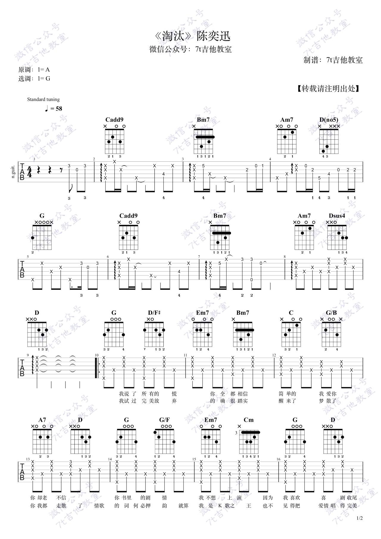 曲谱介绍: 陈奕迅演唱的一首歌曲,4/4拍的节奏,这首歌曲的原调为A调,这里曲谱采用了G调指法进行编配,演唱时夹变调夹2品可回到原调,也可根据个人实际嗓音情况选择。曲谱由琴谱网更新上传,来源于@7T吉他教室编配出品。 《淘汰》是陈奕迅第一次跟周杰伦合作,由周杰伦包办词曲的作品。《淘汰》所讲述的是女友对主人公爱情态度的不安猜测及怀疑,于是选择逃避,主人公原本试图潇洒的放弃这段情感,回想起过往时,才发现现实生活中的爱情无法像情歌里的歌词那么完美,面对已经支离破碎的感情,女友用离开为他们的爱情划下句点,他也只好选择放弃。