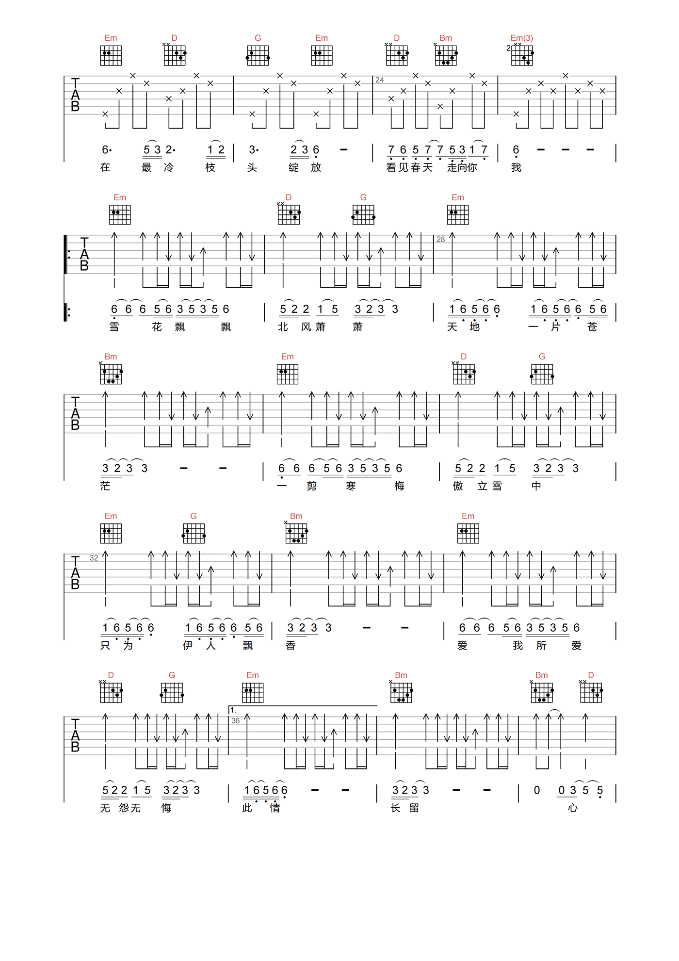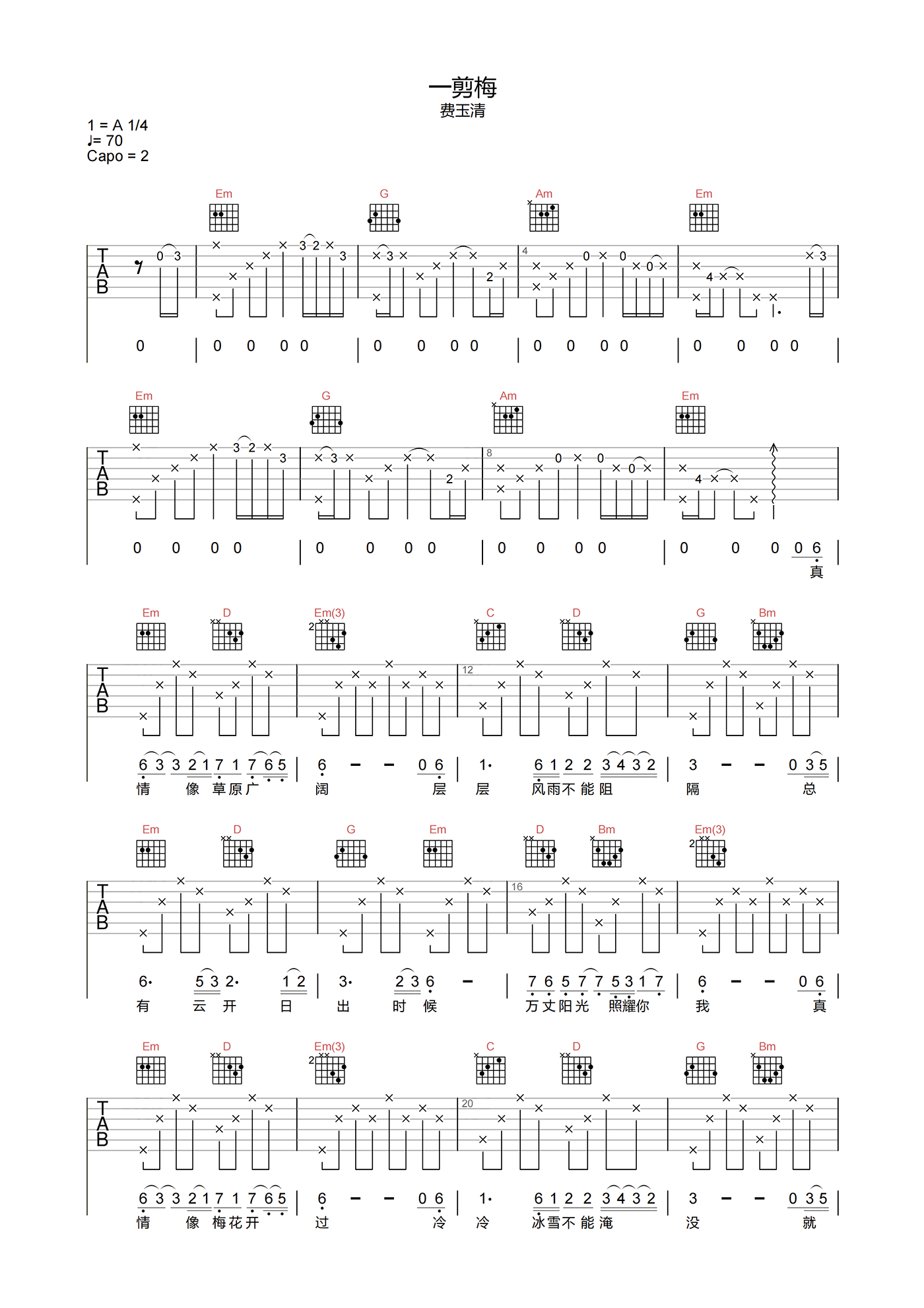 曲谱介绍: 一剪梅吉他谱,费玉清演唱的经典歌曲。《一剪梅》吉他弹唱谱,选用G调指法,原调A调,节奏1/4拍,速度70拍每分钟,带前奏的超原版编配,共有3张高清吉他六线谱图例,难度3级较简单。 悠扬的曲风,小哥(费玉清)绵柔舒缓的嗓音总是那么入人心扉,诠释出只待伊人苞开放唯一的情感,将“一剪寒梅,傲立雪中”的感情表达得淋漓尽致。