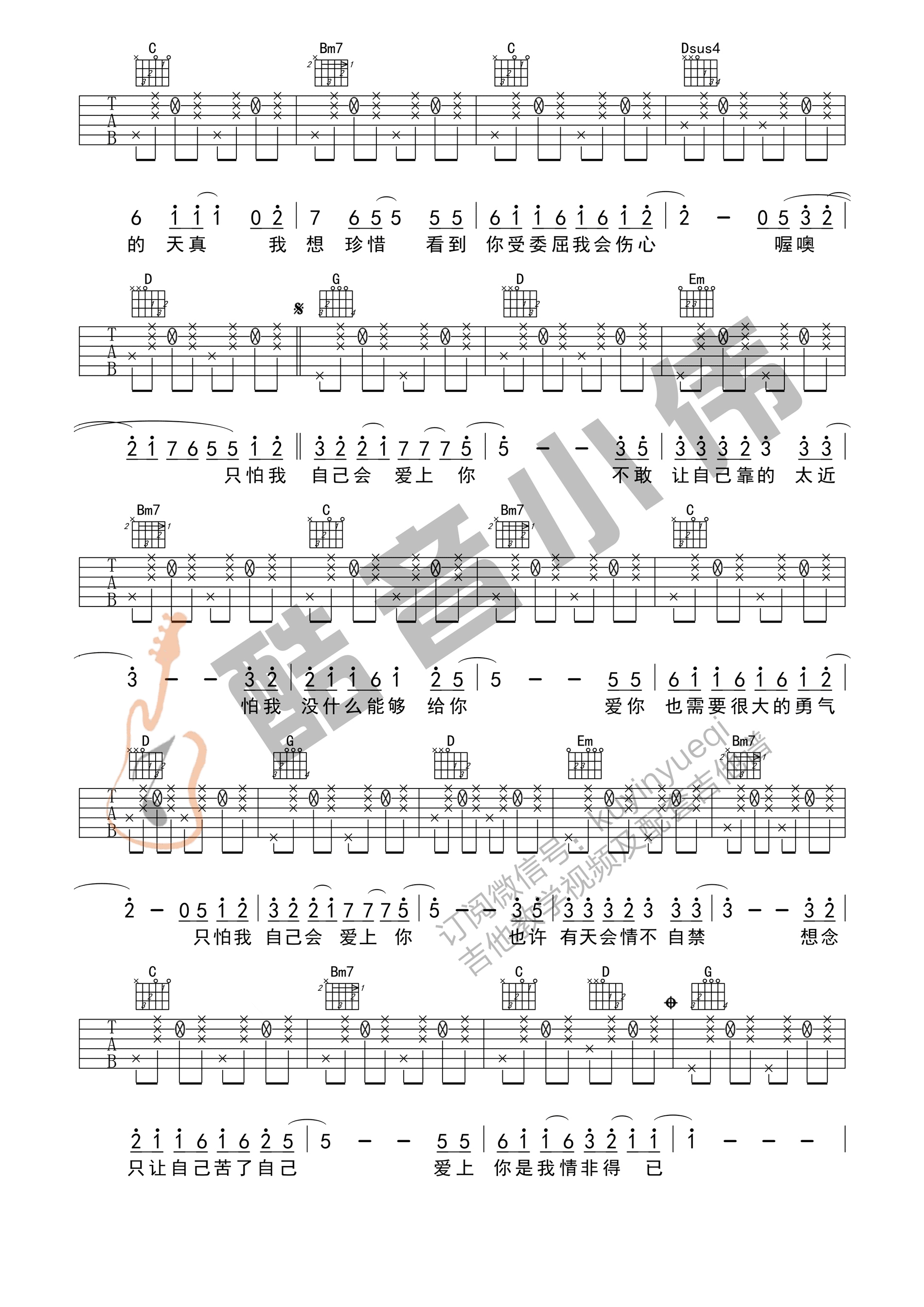 曲谱介绍: 吉他谱介绍:情非得已吉他谱,庾澄庆演唱的一首歌曲,4/4拍的节奏,这首歌曲的原调为C调,这里曲谱采用了G调指法进行编配,演唱时夹变调夹5品可回到原调,也可根据个人实际嗓音情况选择。曲谱由琴谱网更新上传,共3张高清图片弹唱吉他谱例,来源于@酷音小伟编配出品。这首歌可以说是哈林庾澄庆代表作品之一了,同时歌曲也是青春偶像剧《流星花园》主题曲,也算是一代人的记忆。这里的谱子为G调版本,原曲为C调,音比较高,所以这里G调比较适合男生的嗓音演唱,整体难度不大。 情非得已吉他弹唱教学