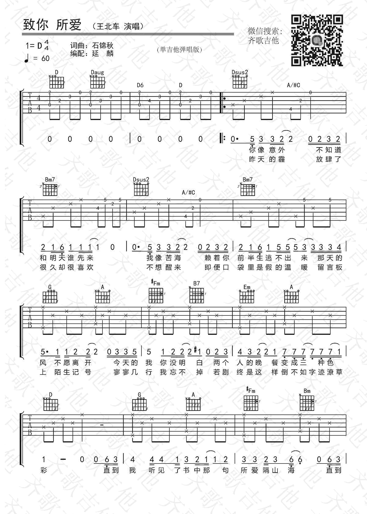 致你所爱吉他谱 - 王北车 - D调吉他弹唱谱
