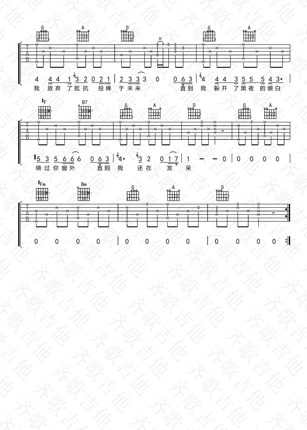 曲谱介绍: 王北车演唱的一首歌曲,4/4拍的节奏,这首歌曲的原调为D调,这里曲谱采用了D调指法进行编配,演唱时可不夹变调夹,曲谱由琴谱网更新上传,来源于@齐歌吉他编配出品。