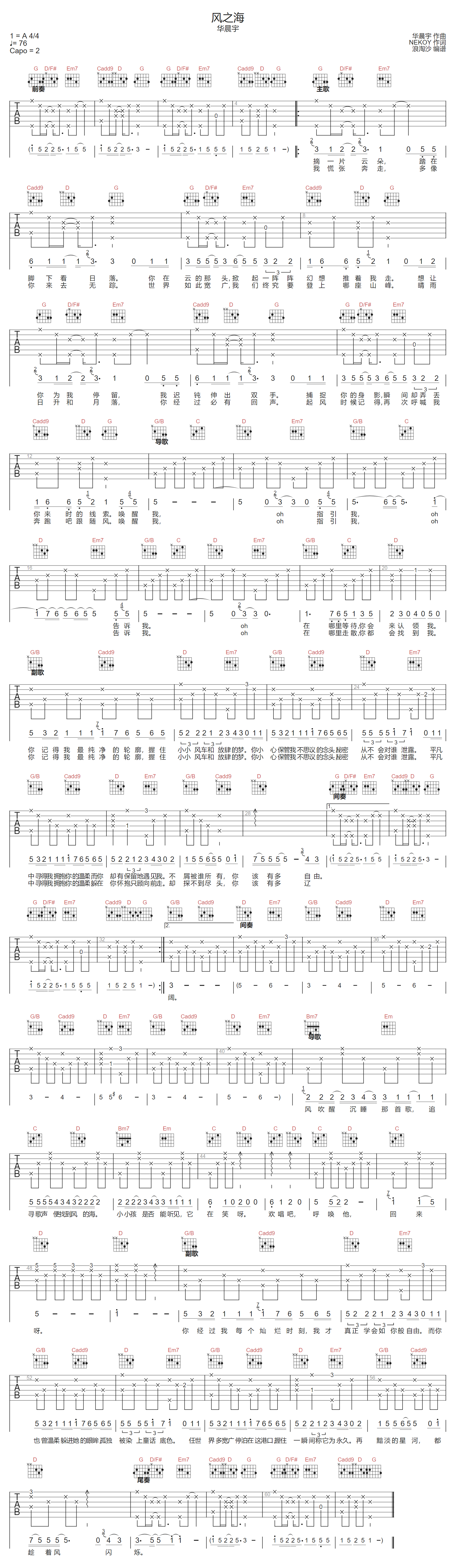 曲谱介绍: 华晨宇演唱的一首歌曲,4/4拍的节奏,这首歌曲的原调为A调,这里曲谱采用了G调指法进行编配,演唱时夹变调夹2品可回到原调,也可根据个人实际嗓音情况选择。曲谱由琴谱网更新上传,来源于@浪淘沙编配出品。 《风之海》是华晨宇演唱的歌曲,发行于2023年9月29日。这首歌曲调性明快,旋律优美,充满了对自然和自由的追求。华晨宇通过细腻的演唱,将听众带入一个奇幻的世界,仿佛可以感受到大海的波涛声和风的呼啸声。
