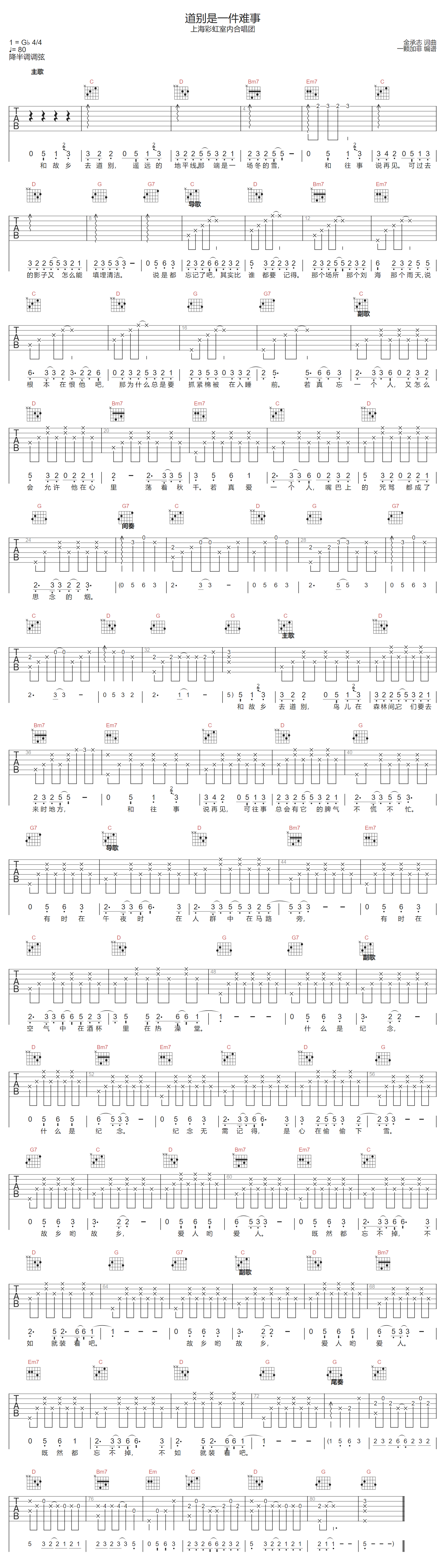 曲谱介绍: 上海彩虹室内合唱团演唱的一首歌曲,4/4拍的节奏,这首歌曲的原调为#F调,这里曲谱采用了G调指法进行编配,演唱时降半音调弦可回到原调,也可根据个人实际嗓音情况选择不降音或夹几品。曲谱由琴谱网更新上传,来源于@一颗加菲编配出品。 今天再听到《道别是一件难事》,我确信音能储存记忆,想了很久想不起22年冬天,听到这首歌,记忆就像覆有细碎阳光的叶片,慢慢地落在地上。