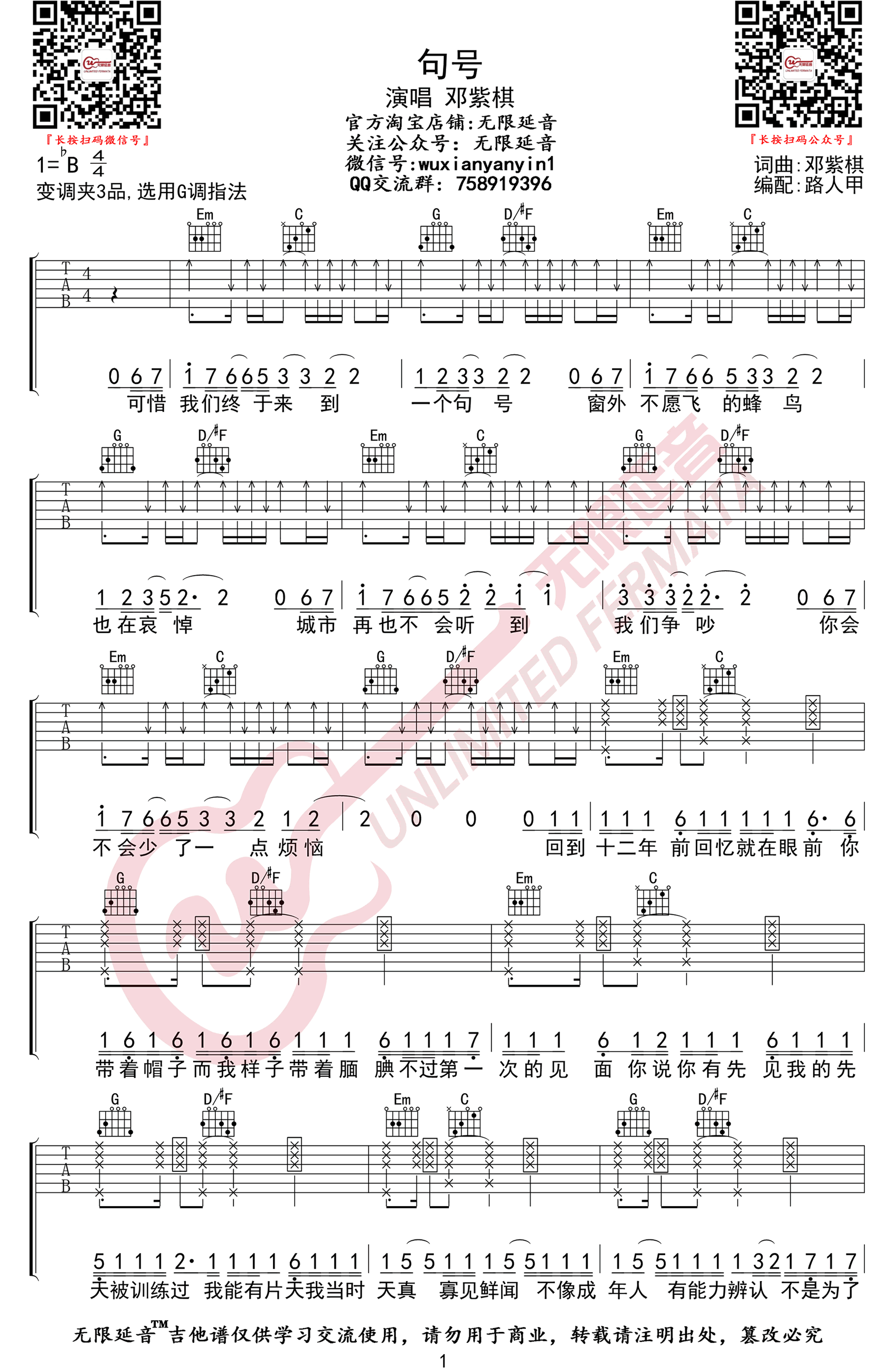 曲谱介绍: 句号是邓紫棋演唱的一首歌曲,4/4拍的节奏,这首歌曲的原调为降B调,这里曲谱采用了G调指法进行编配,演唱时夹变调夹3品可回到原调,也可根据个人实际嗓音情况选择。曲谱由琴谱网更新上传,来源于@无限延音编配出品。 G.E.M.邓紫棋推出新歌《句号》,其MV在两天内突破200万点击量。其寓意是G.E.M.邓紫棋与过去告别,准备开启属于她的崭新的音乐版图。 图片 她说,这首歌的过程更像是一种自我治愈,谢谢你们喜欢这首歌,或许这就是纪念过去十二年的成长轨迹的最好的方式。