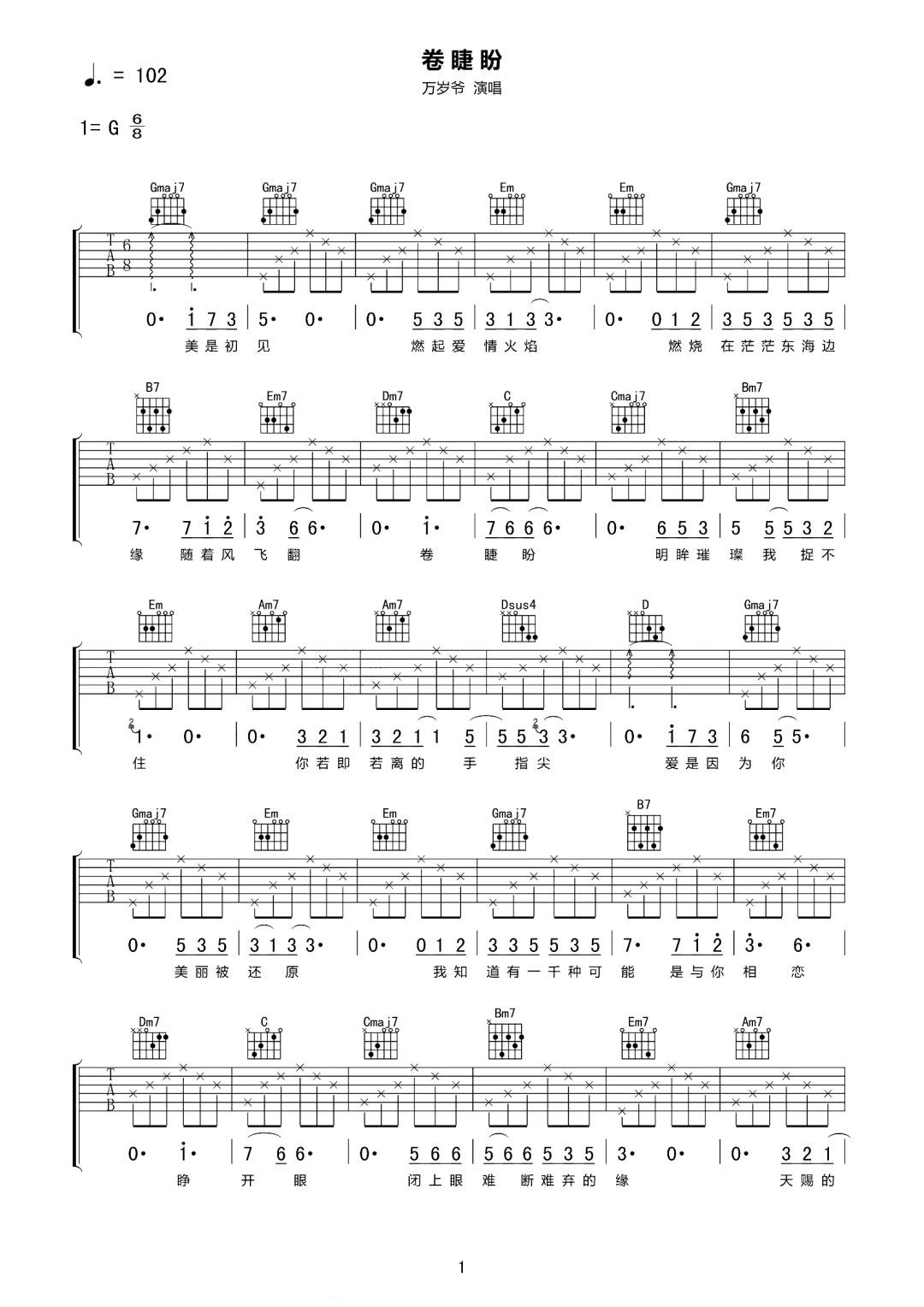 曲谱介绍: 万岁爷演唱的一首歌曲,6/8拍的节奏,这首歌曲的原调为G调,这里曲谱采用了G调指法进行编配,演唱时可不夹变调夹,曲谱由琴谱网更新上传,曲谱来源于网络转载,编配制谱者暂不详。重新编曲的《卷睫盼》,前奏更为完整,间奏和结尾的重新演奏,也更好的衔接了前后两段的演唱,将原版那种戛然而止的怅然完美的延续,回味无穷。