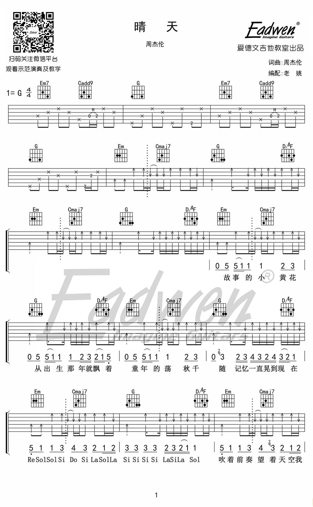 曲谱介绍: 周杰伦《晴天》吉他谱,G调指法编配,六线谱高清版,晴天吉他谱,完整弹唱图片谱。会想起从前不是因为从前有多美好,只是因为,它被刻进了这首歌里,那些时光被凝固在了旋律里,就像一片被晒干了的玫瑰花瓣,在滚烫的水中舒展开来。那些关于青春的纪念,每一段被遗忘的时光都藏在旋律中,那是我们最骄傲也是回不去的单纯美好。
