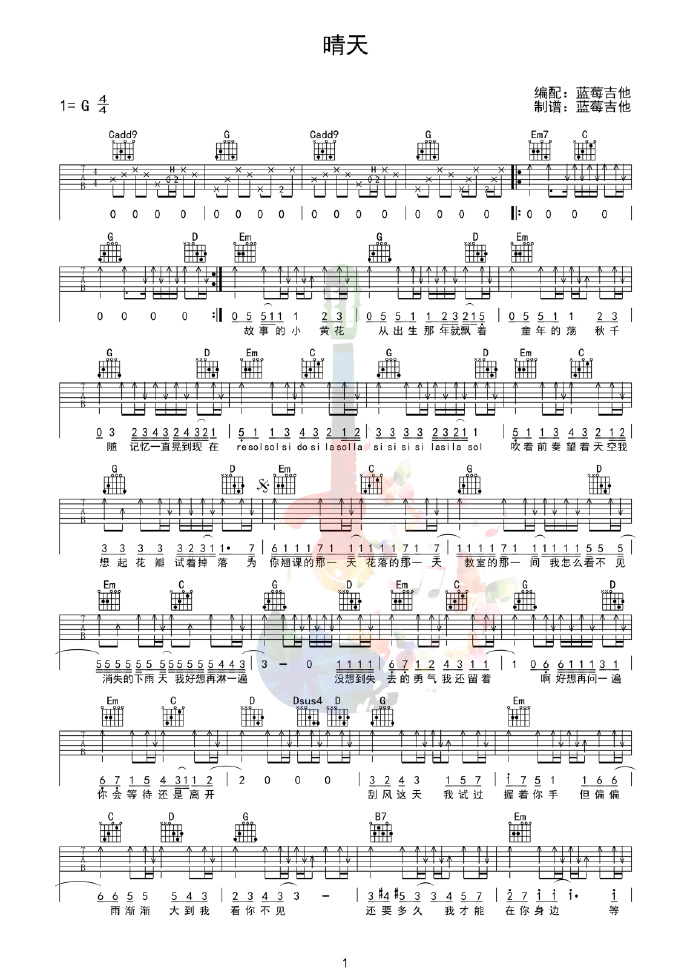 曲谱介绍: 吉他谱介绍:晴天吉他谱,周杰伦演唱的一首歌曲,4/4拍的节奏,这首歌曲的原调为降A调,这里曲谱采用了降A调指法进行编配,演唱时可不夹变调夹,曲谱由琴谱网更新上传,共2张高清图片弹唱吉他谱例,来源于@蓝莓吉他编配出品。周董周杰伦创作的一首经典歌曲,“故事的小黄花,从出生那年就飘着”,每当听见这段熟悉的旋律,就会想起当年那青春的时光。练习这首歌的要点,主要在于扫弦节奏型和后面的B7和弦的熟练掌握。