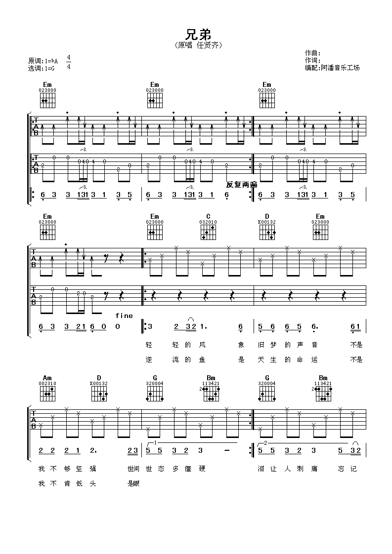 曲谱介绍: 任贤齐演唱的一首歌曲,4/4拍的节奏,这首歌曲的原调为降A调,这里曲谱采用了G调指法进行编配,演唱时夹变调夹1品可回到原调,也可根据个人实际嗓音情况选择。曲谱由琴谱网更新上传,来源于@阿潘音乐工场编配出品。这首歌主要就是讲一个人为了兄弟情义而牺牲掉自己幸福的故事。两个兄弟,一个是唱戏的,过得比较安定;一个是到处漂泊的,过得很坎坷,两人同时喜欢上了一个女孩。