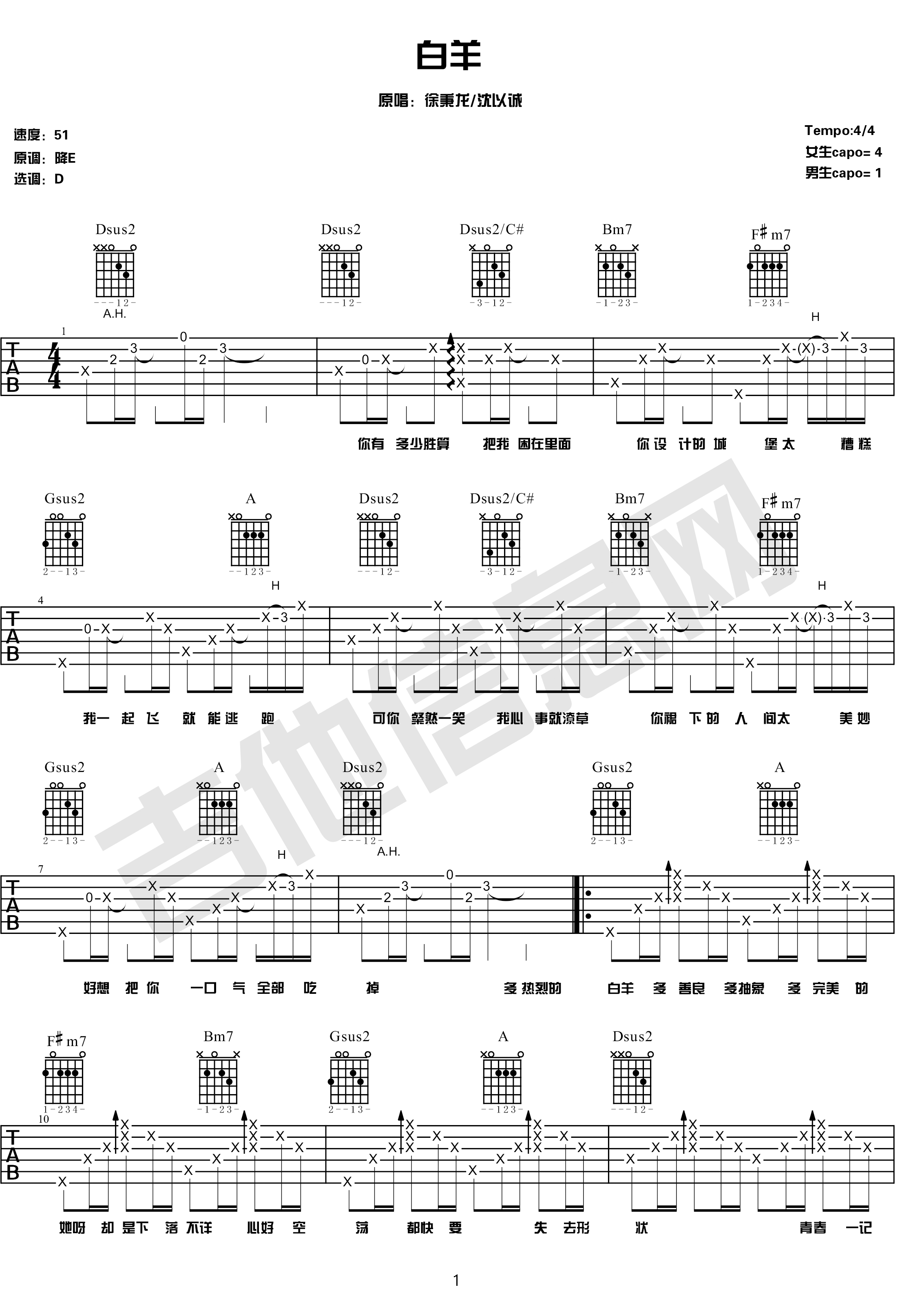 白羊吉他谱 - 徐秉龙/沈以诚 - D调吉他弹唱谱