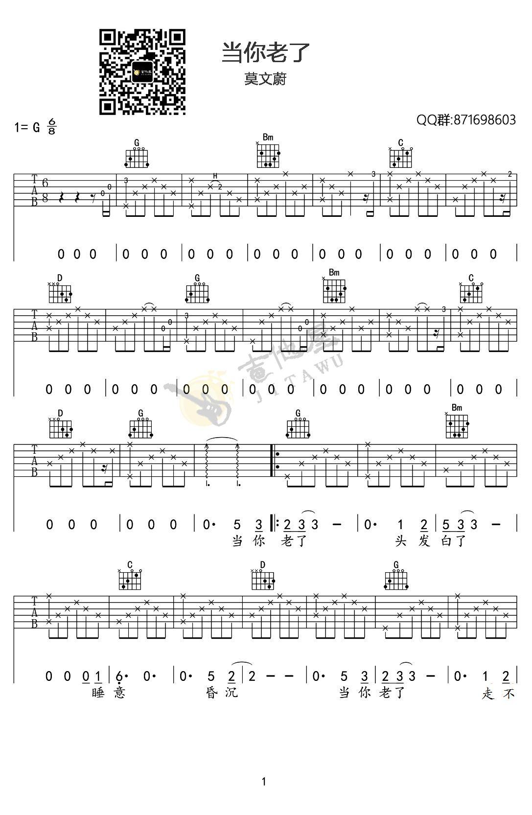 曲谱介绍: 莫文蔚演唱的一首歌曲,6/8拍的节奏,这首歌曲的原调为G调,这里曲谱采用了G调指法进行编配,演唱时可不夹变调夹,曲谱由琴谱网更新上传,曲谱来源于网络转载,编配制谱者暂不详。这首歌原唱为赵照,原唱可能不被很多人所熟知,所以许多人第一次听到都是听的莫文蔚在春晚上的翻唱版本,女生版的《当你老了》被莫文蔚翻唱的其实也别有一番风味。