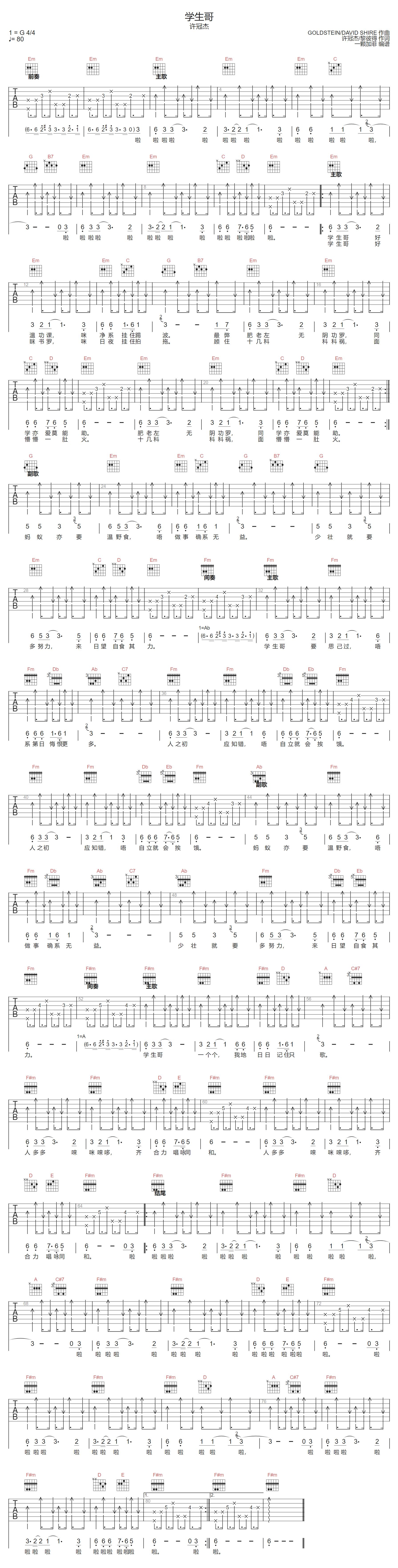 曲谱介绍: 许冠杰演唱的一首歌曲,4/4拍的节奏,这首歌曲的原调为G调,这里曲谱采用了G调指法进行编配,演唱时可不夹变调夹,曲谱由琴谱网更新上传,来源于@一颗加菲编配出品。在许冠杰创作的粤语歌曲中,有超过65首歌将大量的广府话融入其中。除了这首《学生哥》,还有《半斤八两》、《打雀英雄传》等,大多使用了口语化的俚语,和流传于日常对话中的词句,唱起来朗朗上口。