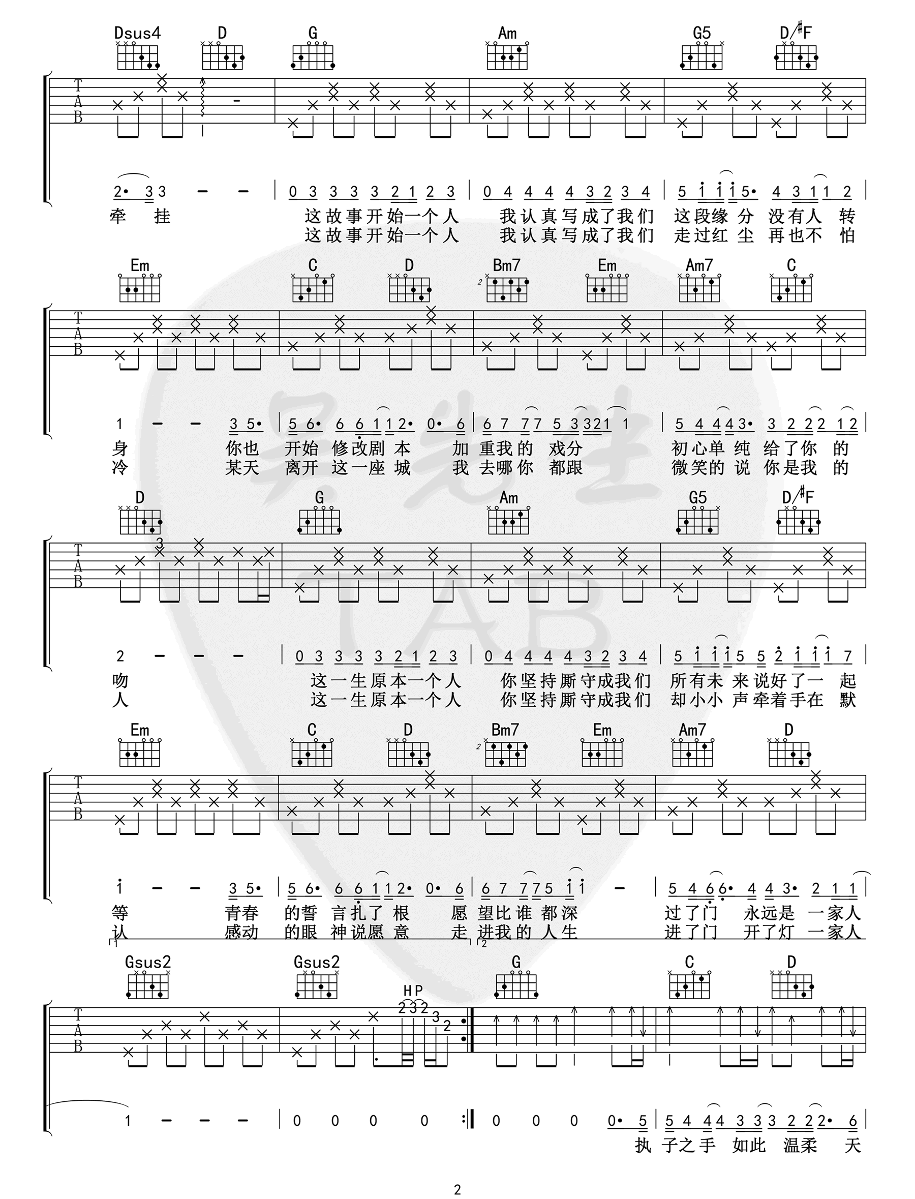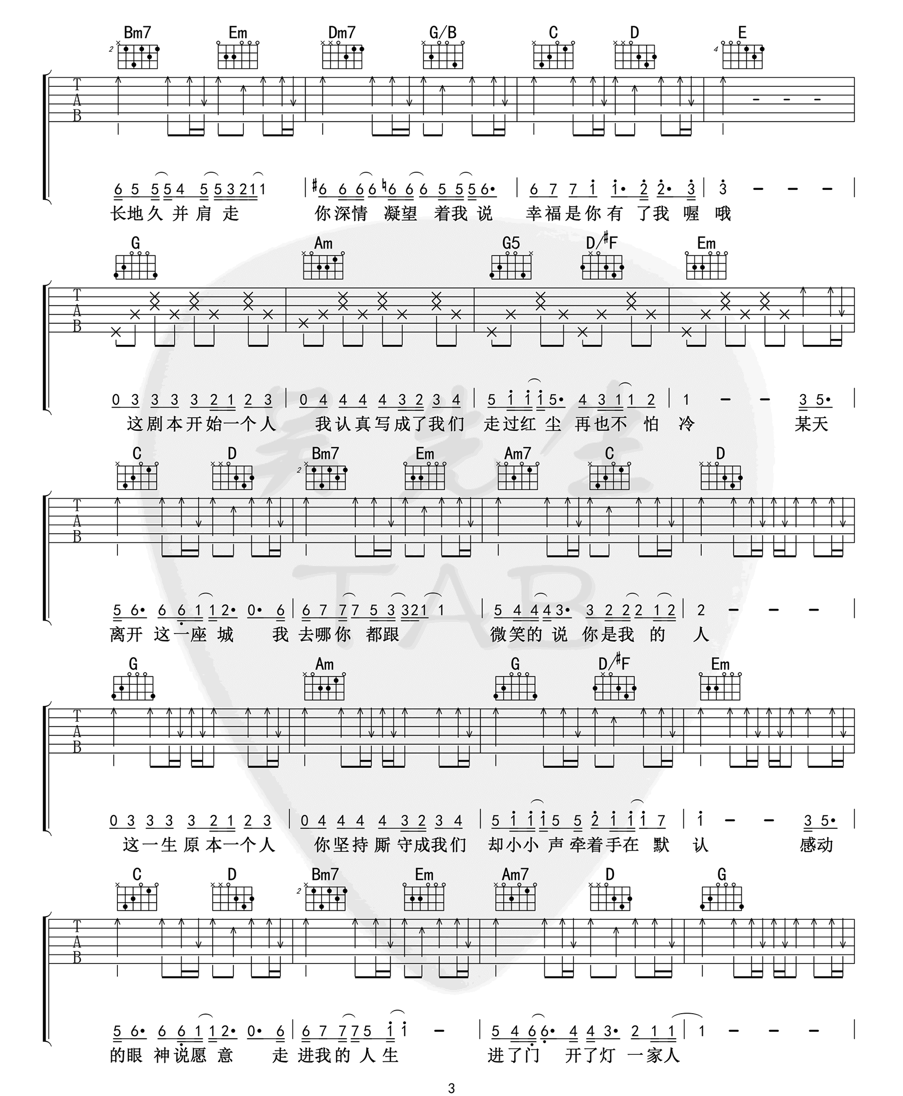曲谱介绍: 林俊杰演唱的一首歌曲,4/4拍的节奏,这首歌曲的原调为降A调,这里曲谱采用了G调指法进行编配,演唱时夹变调夹1品可回到原调,也可根据个人实际嗓音情况选择。曲谱由琴谱网更新上传,来源于@吴先生TAB编配出品。在这首歌中,林俊杰极具辨识度的嗓音,将眷侣的厮守故事化作最深情的告白,搭配方文山擅长的绵密文字,用贴近人心的细节描绘出最深刻且珍贵的情感,将这首歌成为结成连理的最美传递。