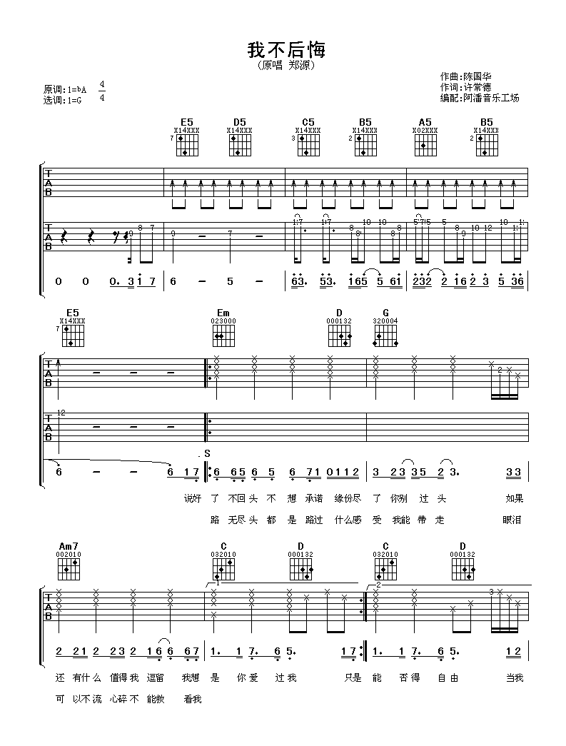我不后悔吉他谱 - 郑源 - G调吉他弹唱谱 - 原版