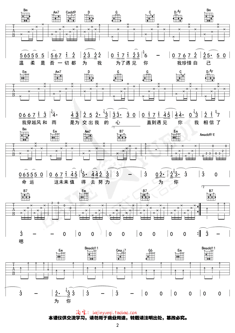 曲谱介绍: 薛之谦演唱的一首歌曲,4/4拍的节奏,这首歌曲的原调为B调,这里曲谱采用了G调指法进行编配,演唱时夹变调夹4品可回到原调,也可根据个人实际嗓音情况选择。曲谱由琴谱网更新上传,来源于@八戒乐器编配出品。这首歌让我们听到了薛之谦不同的声音与深情,终于不再是苦情歌了。歌曲唱着为相遇而付出的努力,深情动人地表达了对爱情的期待。