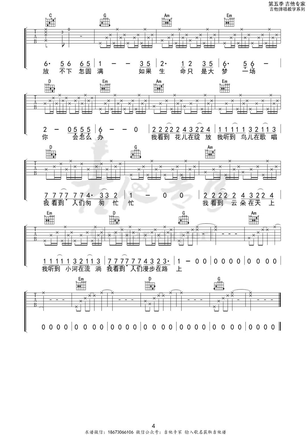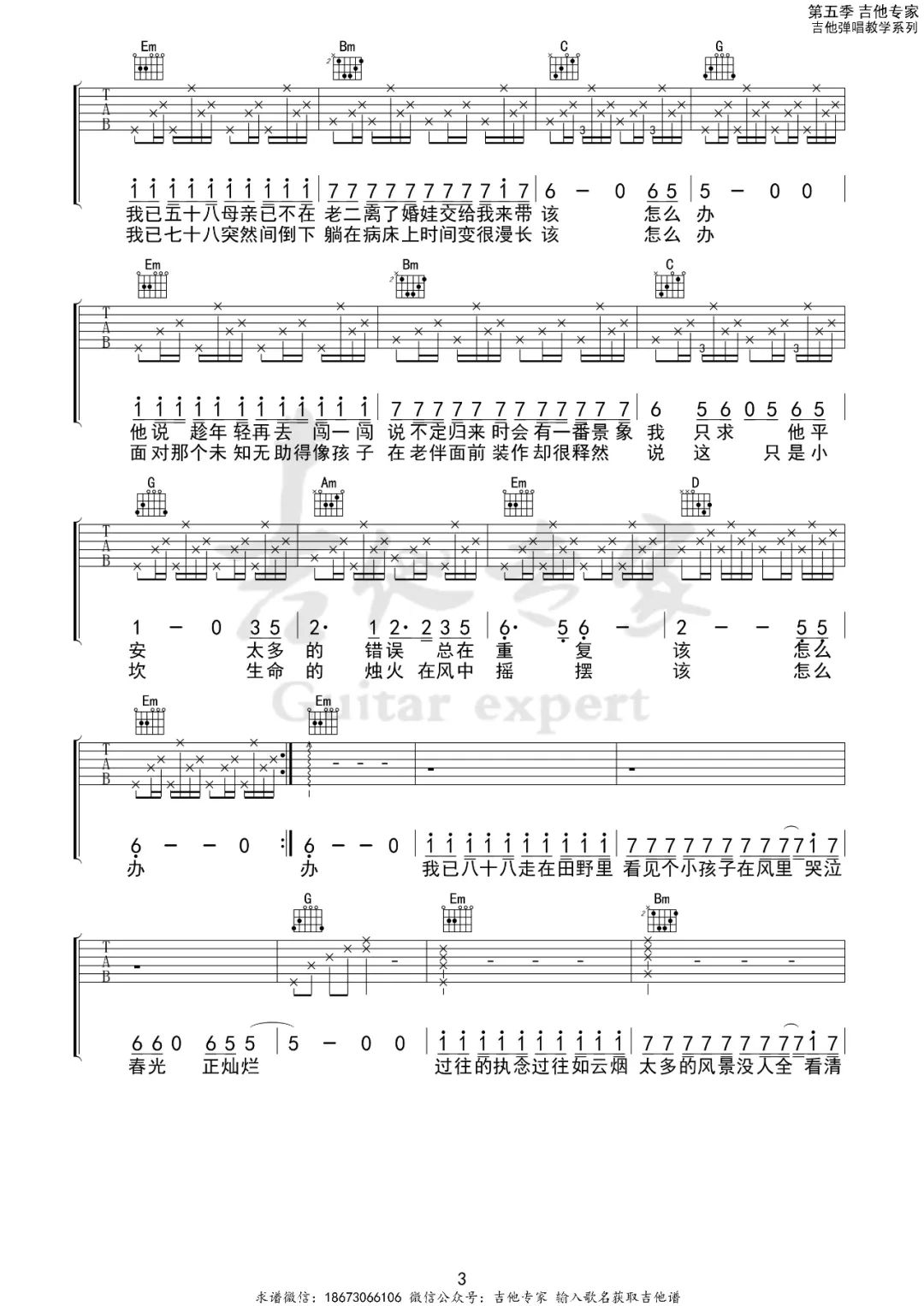 曲谱介绍: 任素汐演唱的一首歌曲,4/4拍的节奏,这首歌曲的原调为D调,这里曲谱采用了G调指法进行编配,演唱时夹变调夹7品可回到原调,也可根据个人实际嗓音情况选择。曲谱由琴谱网更新上传,来源于@吉他专家编配出品。这首长达九分钟的歌曲,以独特的视角和深情的演绎,唱尽了人的一生,从六岁到八十八岁,展现了一个充满无奈和飘渺的生而为人的一生。