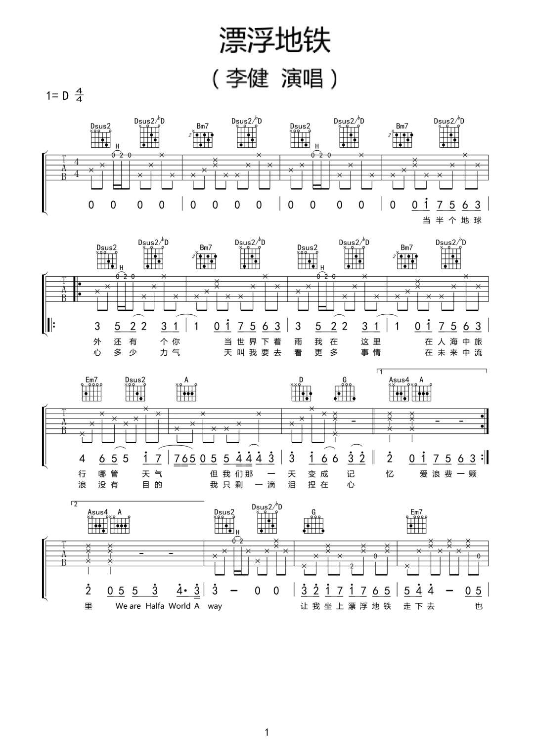 漂浮地铁吉他谱 - 李健 - D调吉他弹唱谱 - 原版