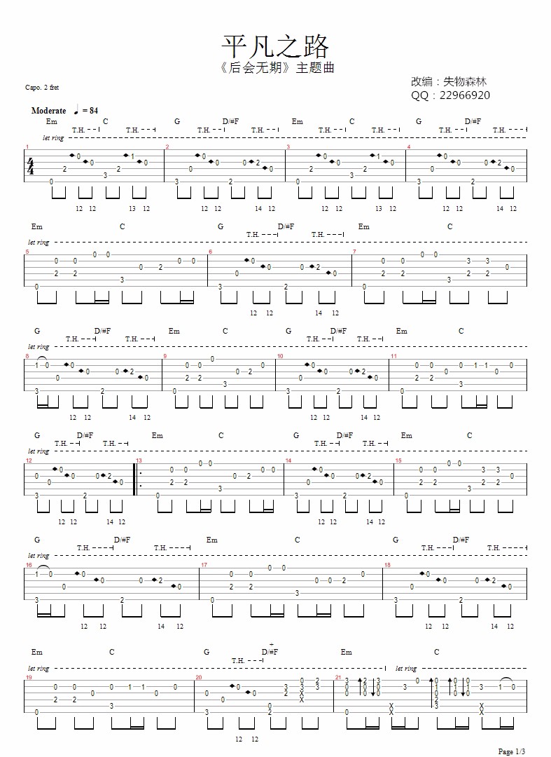 平凡之路吉他谱 - 朴树 - 吉他独奏谱