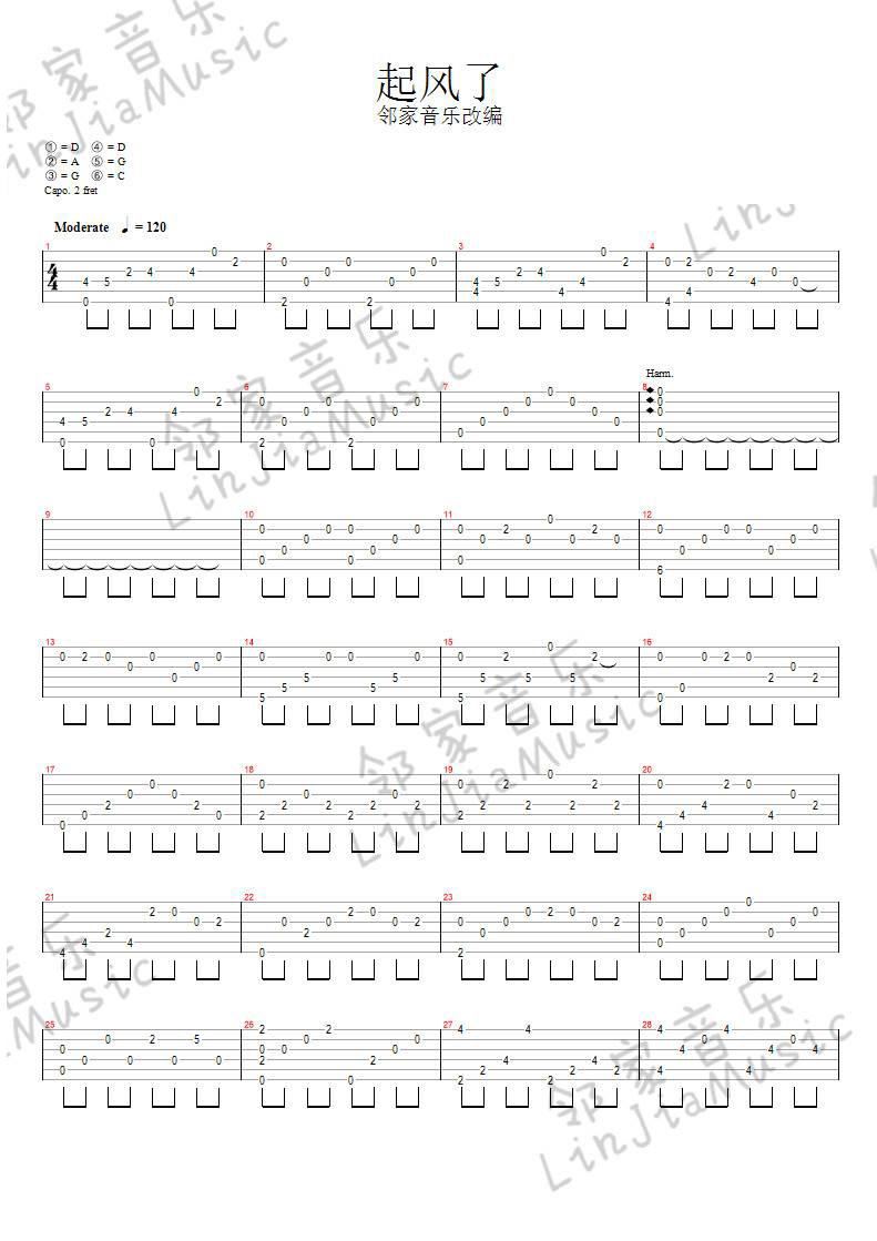 曲谱介绍: 买辣椒也用券的一首指弹吉他曲目,这首曲子采用的是特殊调弦,4/4拍的节奏,练习之前6根琴弦需要调到对应的音,曲谱上有标注,注意调音过程中不要断弦。小技巧:琴弦振动过程中不要调音,用手制音之后再旋转弦钮,会大大降低断弦的几率。演奏时建议夹变调夹2品,也可根据个人实际情况选择。曲谱由琴谱网更新上传,来源于@邻家音乐编配出品。这首歌原本是一首日语歌曲,后来买辣椒也用券翻唱成中文版,受到很多网友的好评,这里是邻家音乐改编的指弹版本。 吉他弹唱演示及视频教学