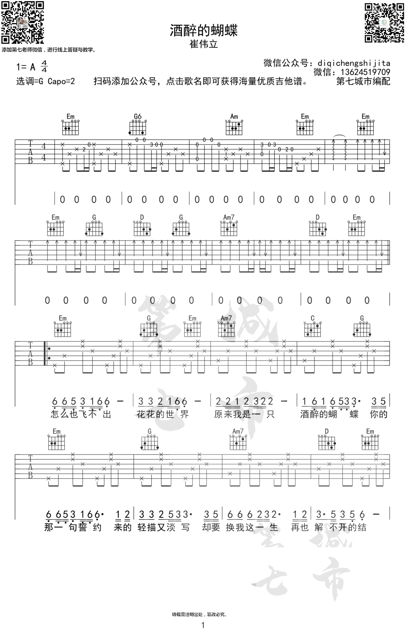酒醉的蝴蝶吉他谱 - 崔伟立 - G调吉他弹唱谱 - 原版