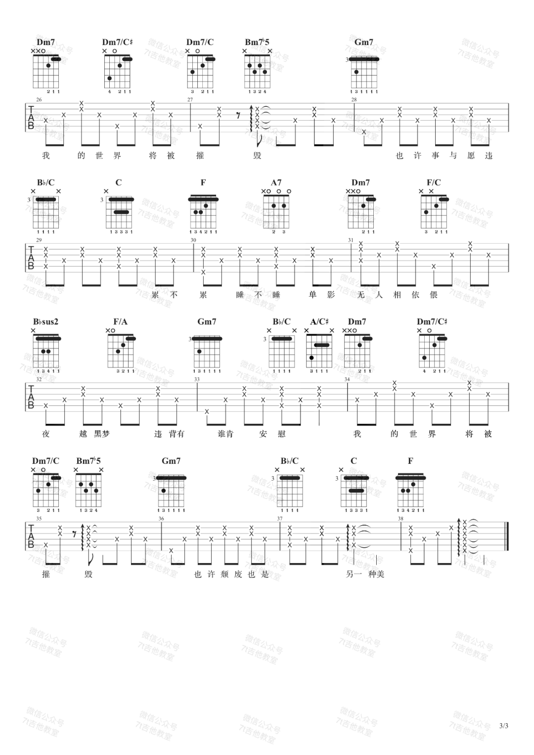 曲谱介绍: 周杰伦演唱的一首歌曲,4/4拍的节奏,这首歌曲的原调为G调,这里曲谱采用了F调指法进行编配,演唱时夹变调夹2品可回到原调,也可根据个人实际嗓音情况选择。曲谱由琴谱网更新上传,来源于@7T吉他教室编配出品。这首歌最早由咻比嘟哗组合演唱,这首歌用完全不同于其他流行歌曲的模式,写出了“逆境”、“绝望”、“无奈”、“乐观”的复杂心情。