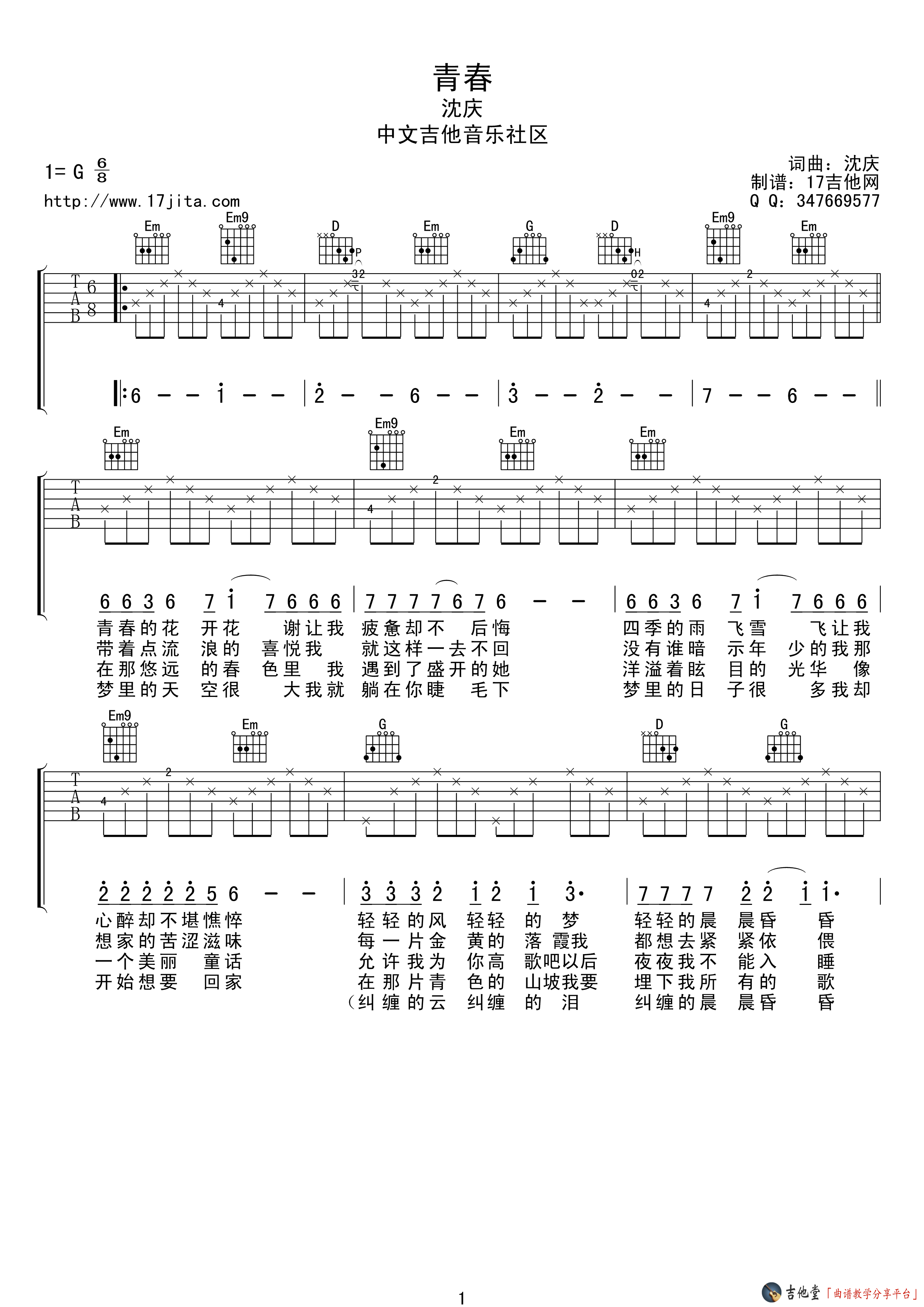 青春吉他谱 - 沈庆 - G调吉他弹唱谱 - 原版