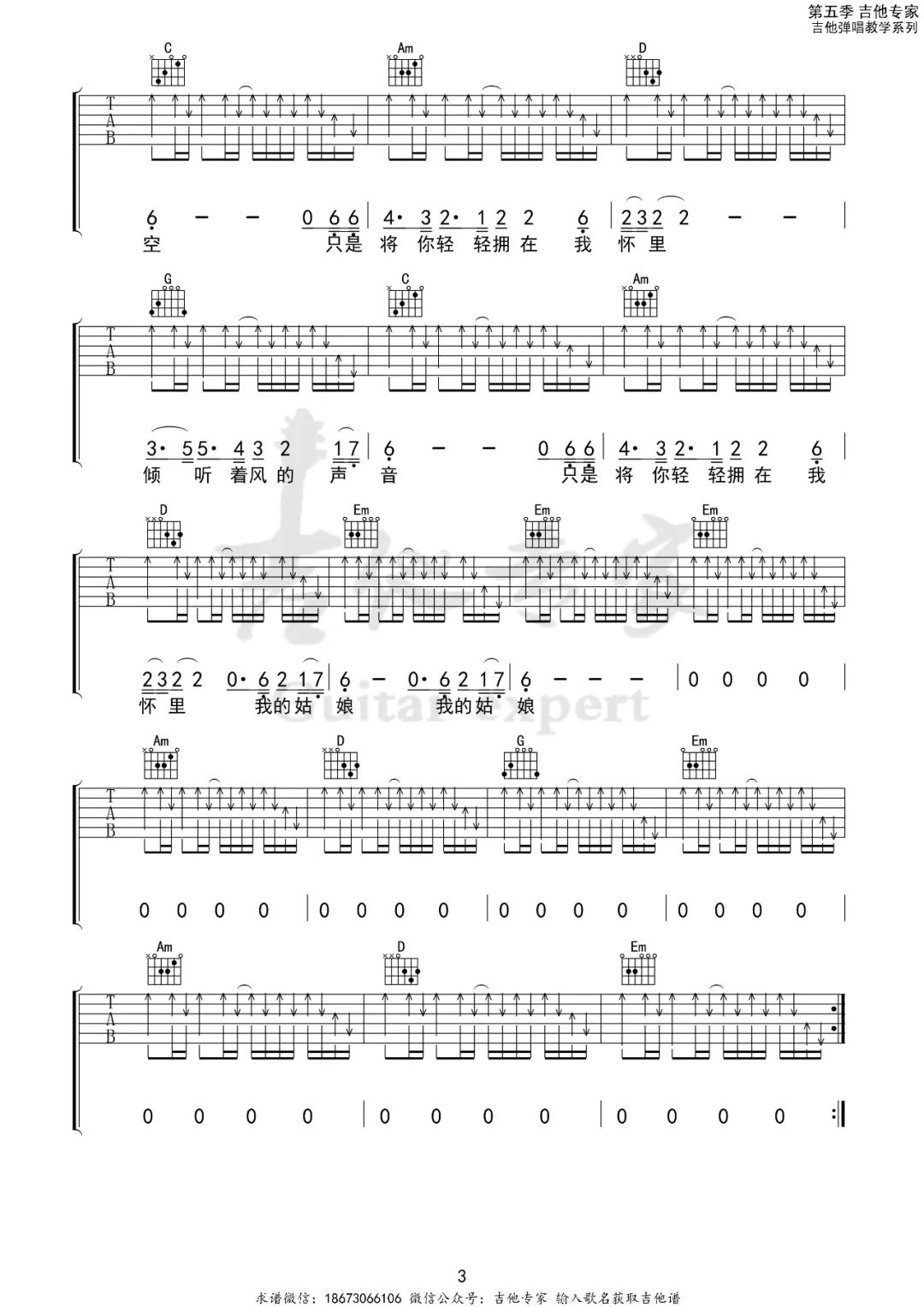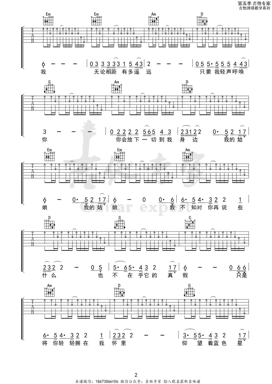 曲谱介绍: 许巍演唱的一首歌曲,4/4拍的节奏,这首歌曲的原调为A调,这里曲谱采用了G调指法进行编配,演唱时夹变调夹2品可回到原调,也可根据个人实际嗓音情况选择。曲谱由琴谱网更新上传,来源于@吉他专家编配出品。这首歌的旋律很美,把人的灵魂置身于一个绝美的境地,仿佛在蔚蓝色星空下、面向辽阔的原野、轻抚微风都出现在我们面前。悠远与惆怅,一个分手的背景故事,许巍少见的高音调开头,把空灵感和旷远感演绎到极致。