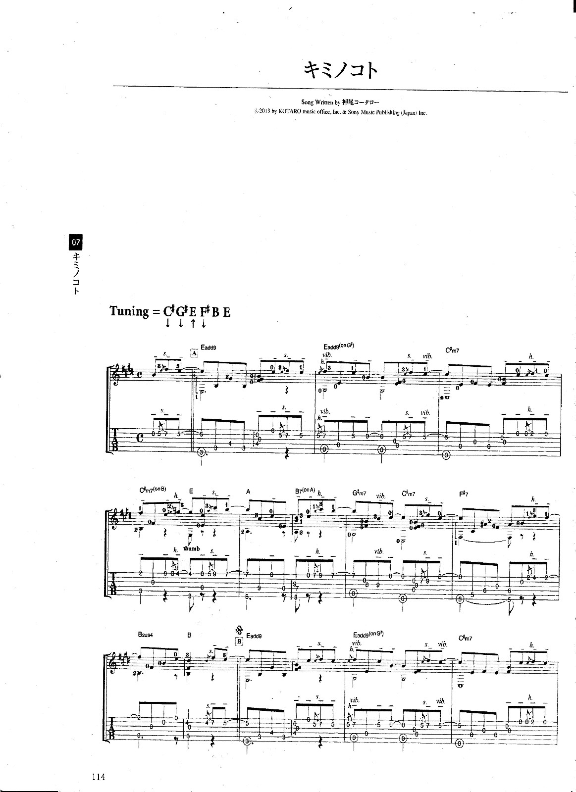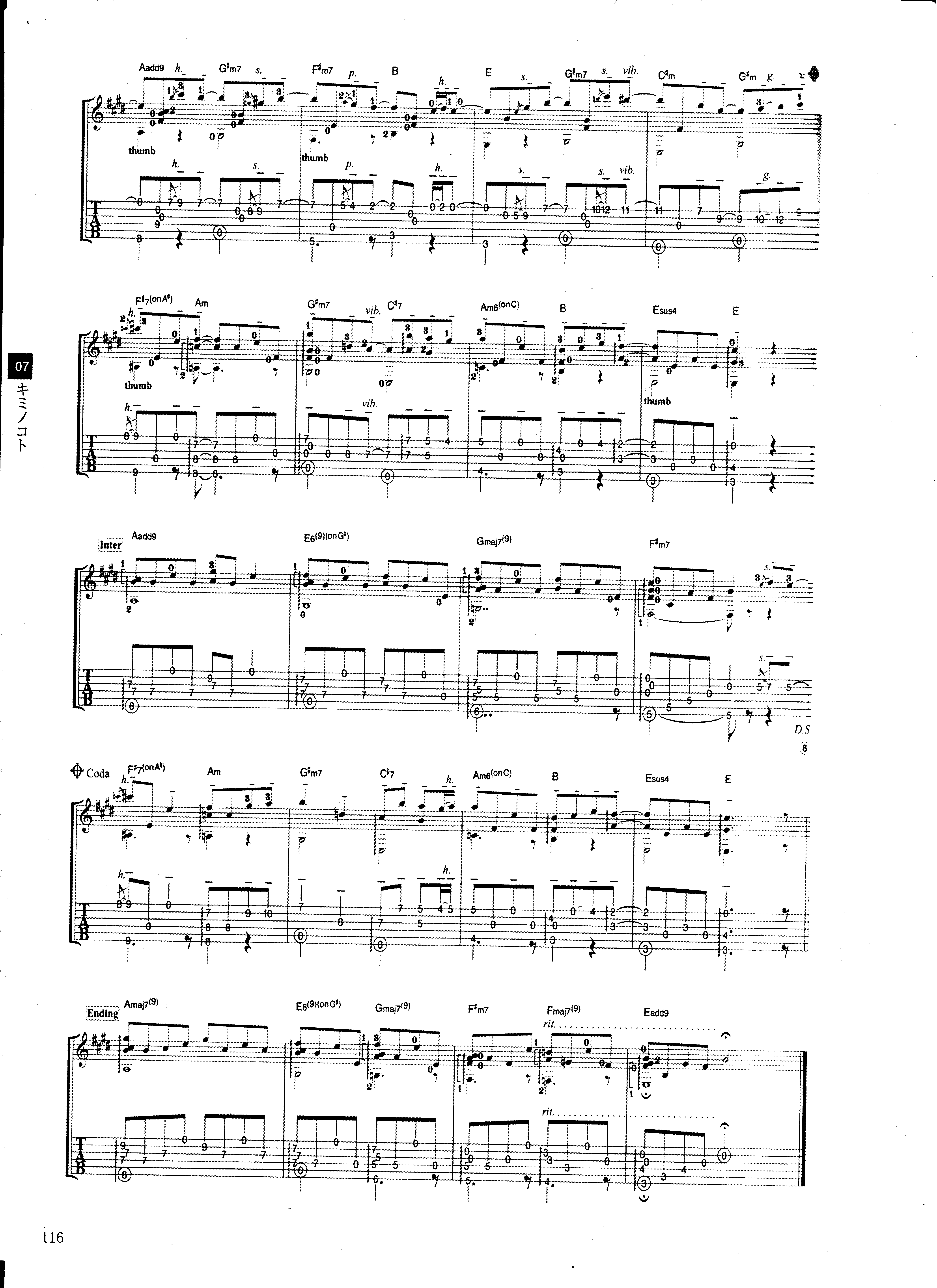 曲谱介绍: 押尾桑的一首指弹吉他曲目,这首曲子采用的是特殊调弦,4/4拍的节奏,练习之前6根琴弦需要调到对应的音,曲谱上有标注,注意调音过程中不要断弦。小技巧:琴弦振动过程中不要调音,用手制音之后再旋转弦钮,会大大降低断弦的几率。演奏时可不夹变调夹,曲谱由琴谱网更新上传,曲谱来源于网络转载,编配制谱者暂不详。本次分享的是从押尾的原版专辑书里面扫描下来的原版曲谱,追求原版的琴友一定不能错过了,但因为是扫描图片所以清晰度不是特别高。