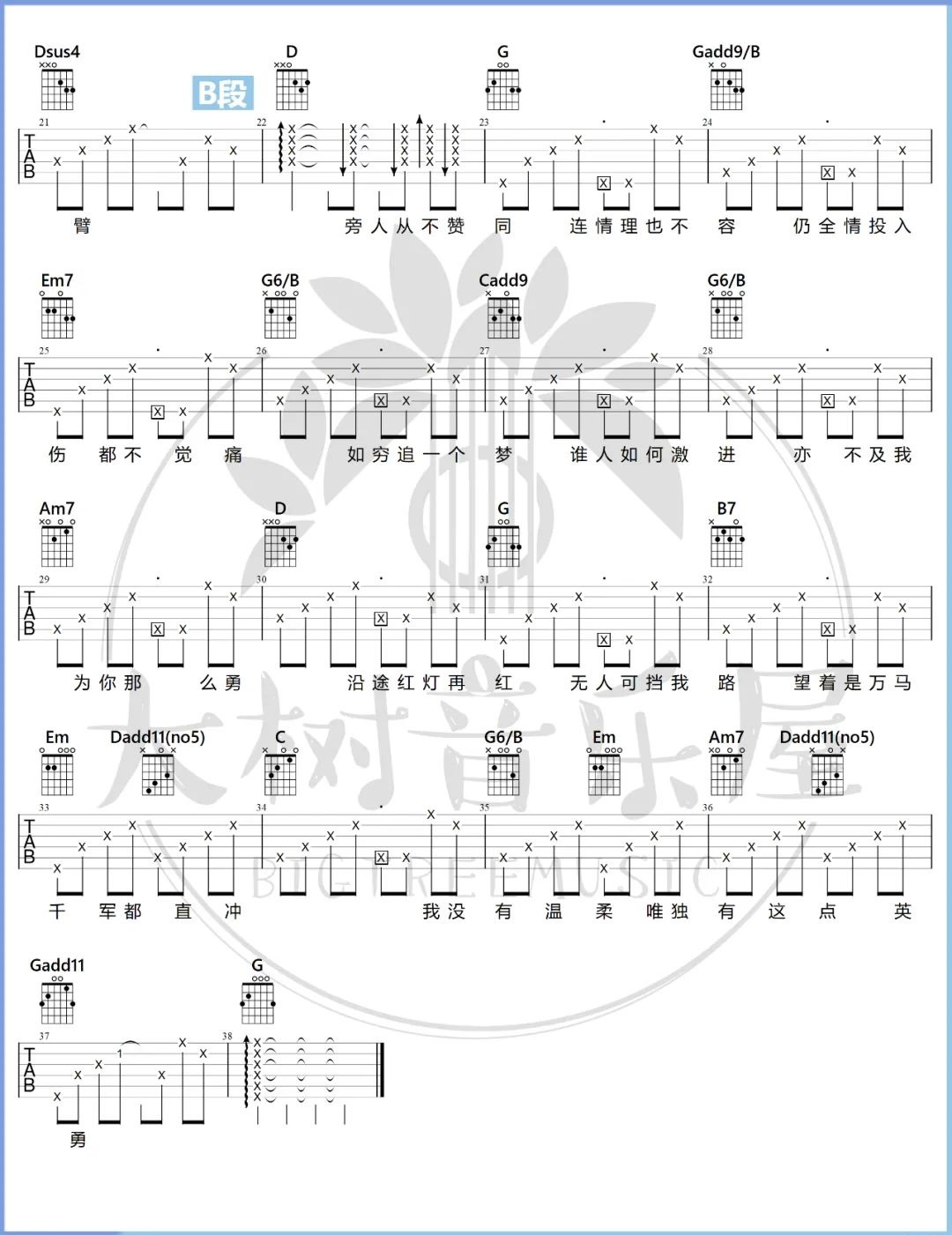 曲谱介绍: 杨千嬅演唱的一首歌曲,4/4拍的节奏,这首歌曲的原调为G调,这里曲谱采用了G调指法进行编配,演唱时可不夹变调夹,曲谱由琴谱网更新上传,来源于@大树音乐屋编配出品。这首歌描述的是女主人公为爱英勇的故事,就像不倒翁一样,倒下去,再起来继续英勇。很多人都是缺乏爱一个人的英勇,希望那些犹豫的、忐忑的、渴望爱的,全部英勇地去爱。