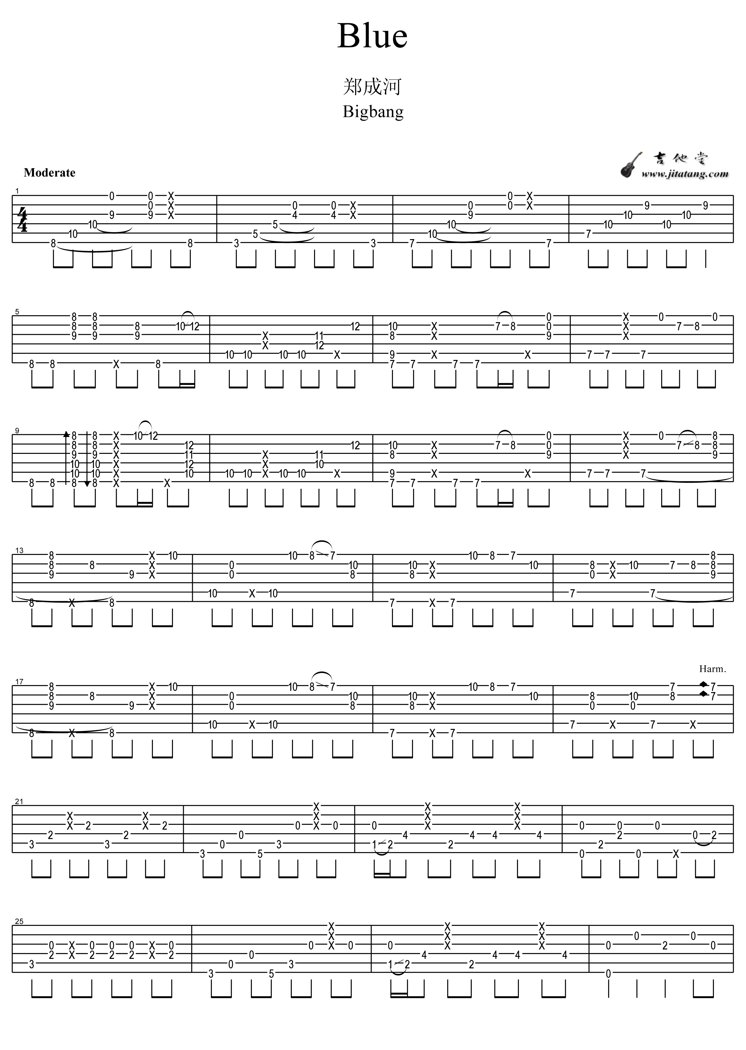 曲谱介绍: 郑成河的一首指弹吉他曲目,这首曲子采用的是标准调弦,4/4拍的节奏,无需特殊调音。演奏时可不夹变调夹,曲谱由琴谱网更新上传,曲谱来源于网络转载,编配制谱者暂不详。这首歌是BigBang演唱的歌曲,这首歌展现了抒情性的旋律和BigBang成员们感性的嗓音。《BLUE》歌如其名,表达了恋人离开后的破碎心情,展示了BigBang感性的一面。